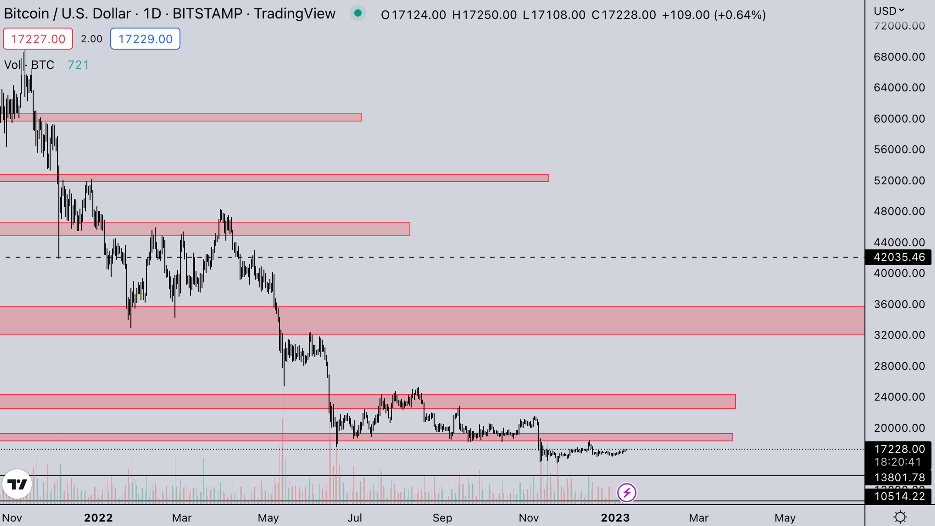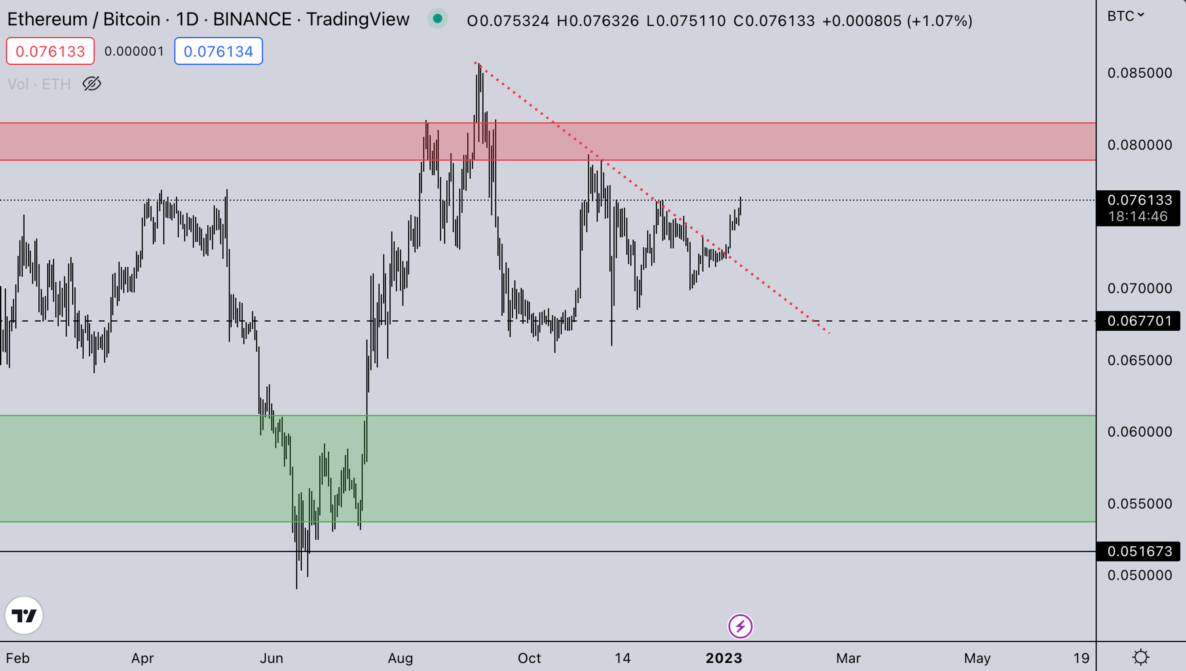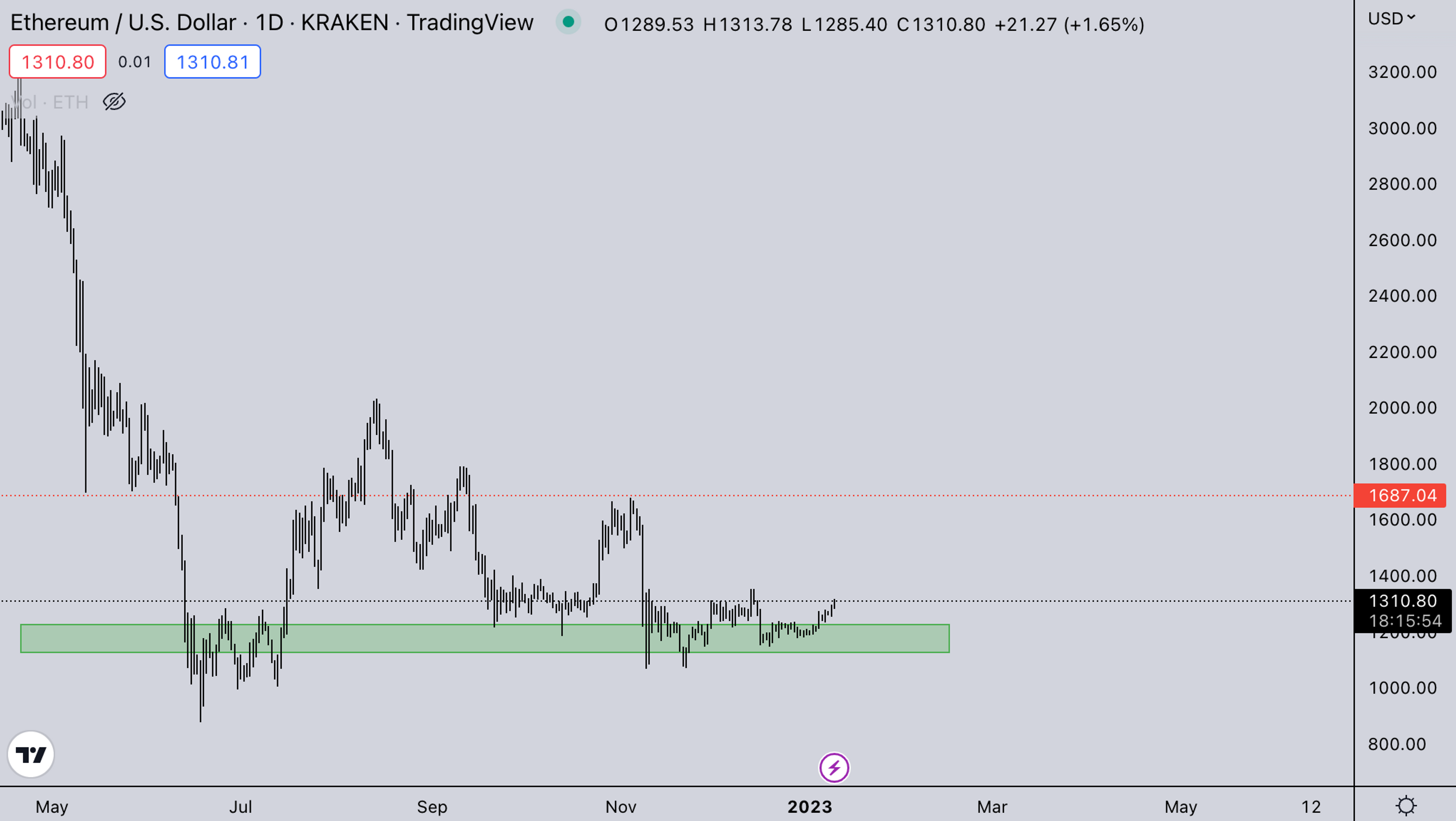 ETH has quite the compression. With volatility hitting historical lows on both ETH and BTC, compressions like this have led to massive moves before the immediate threats of the FTX fraud being frozen in legal strings. There doesn’t seem to be a clear catalyst that’s crypto-specific that could send this lower, other than macro QT and big tech being on a cliff (like AAPL, AMZN, etc…)In March, ETH has the Shanghai upgrade. We think staking will be a popular narrative in the future for institutional investors & maybe even companies. But will those pull the trigger in the current macro environment? We still do not know.