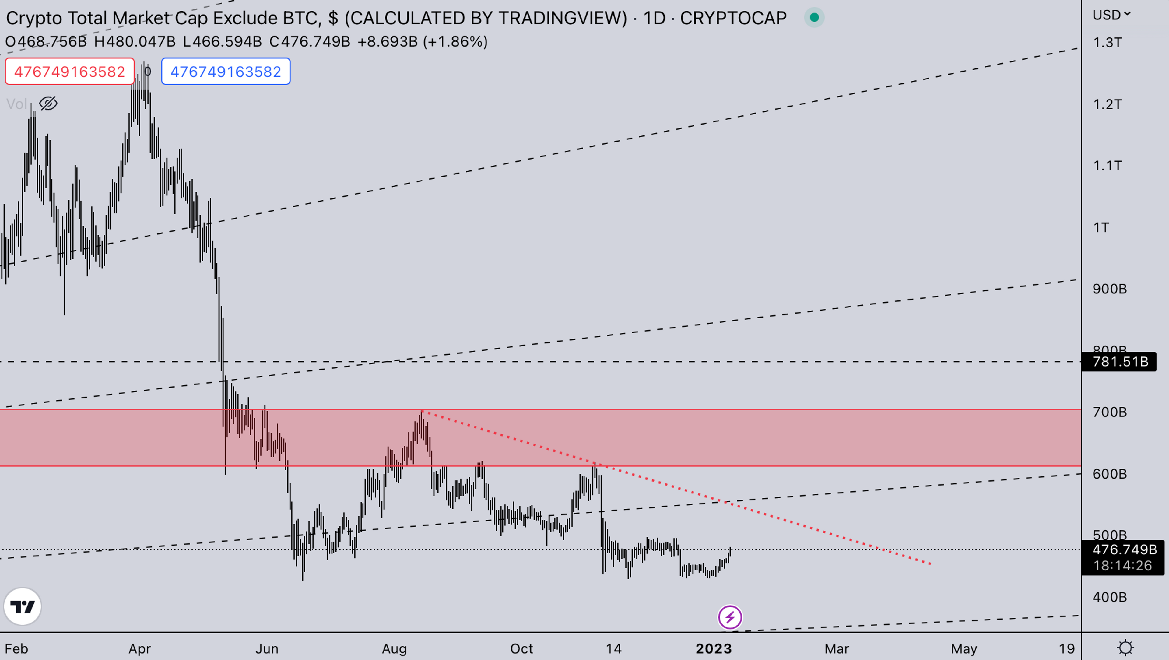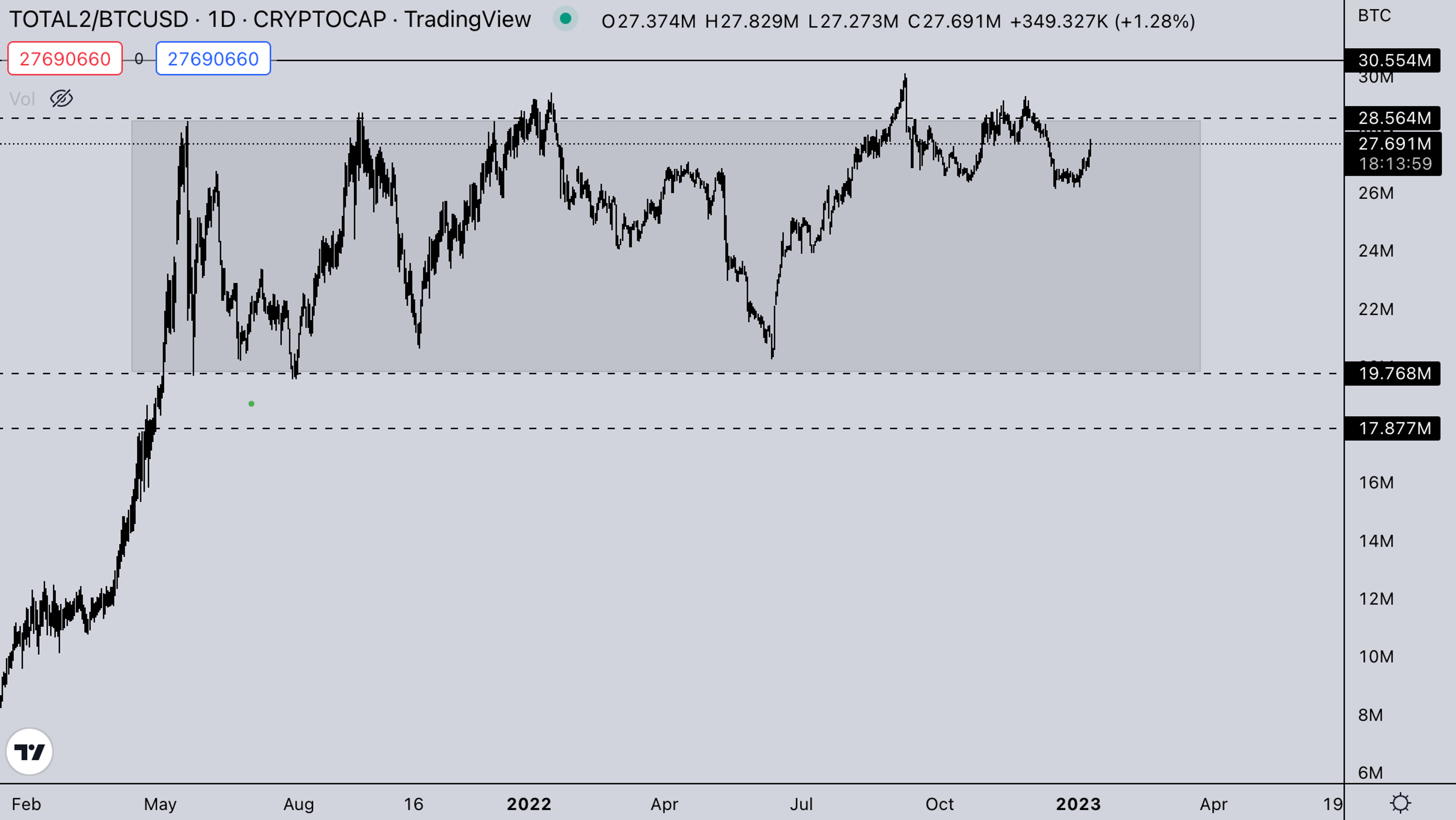TOTAL2/BTC also reflects the recovery on BTC pairing with the majority of alts rallying way more than BTC. For now other than the DCG deadline, with Gemini which we will get to know more about this week, there doesn’t seem to be any crypto-specific risk. We’re still waiting for TOTAL2/BTC to have a defining breakout from this range.