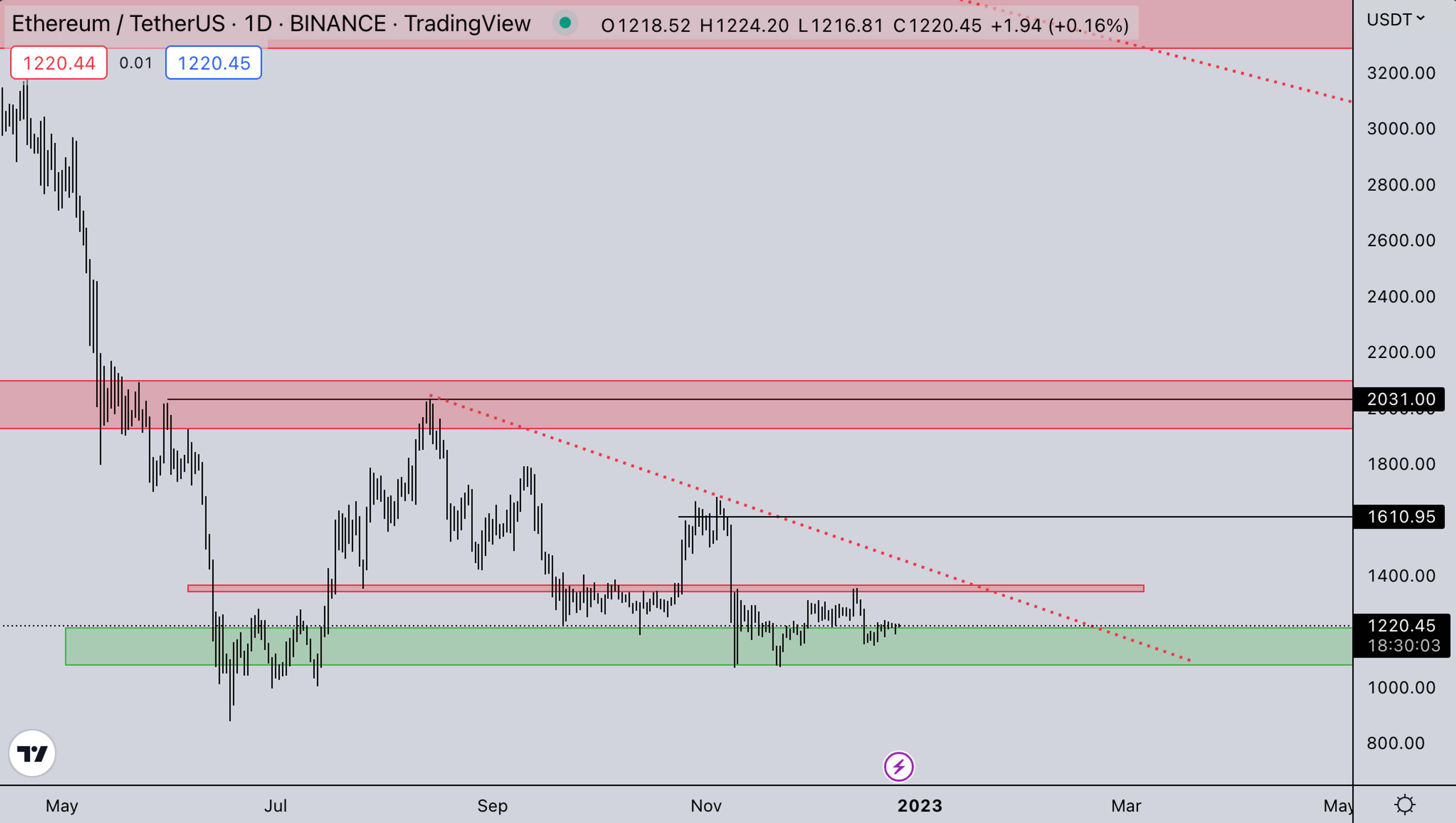 ETH is still sitting on support, with the range also contracting just like BTC. In the next impulse, if it’s upwards, we’d like to see ETH/BTC pick up and take the lead over BTC to finally clear the range (see next slide). If ETH would break under the recent FTX lows ±1065 the probability of breaking the summer lows would increase exponentially. FTX blowup couldn’t push ETH lower than that. So if it breaks, it will most likely correlate to some macro event.