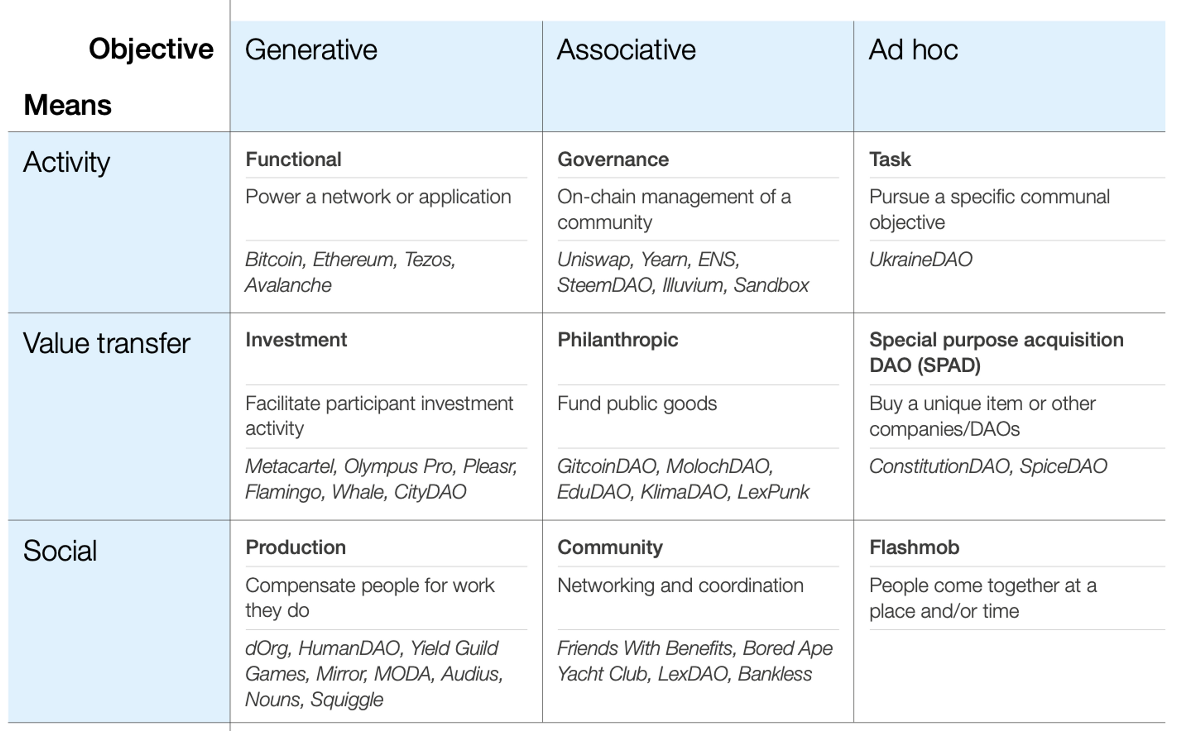 Many DAOs started as investment clubs, but today there are various DAO models based on functions, stretching from grantmaking and networking to functional and driving social impact. According to the World Economic Forum, the DAO landscape can be segmented into nine categories based on objectives (generative, associative, ad hoc) and means (activity, value transfer, social). [caption id="attachment_1357" align="aligncenter" width="1438"]