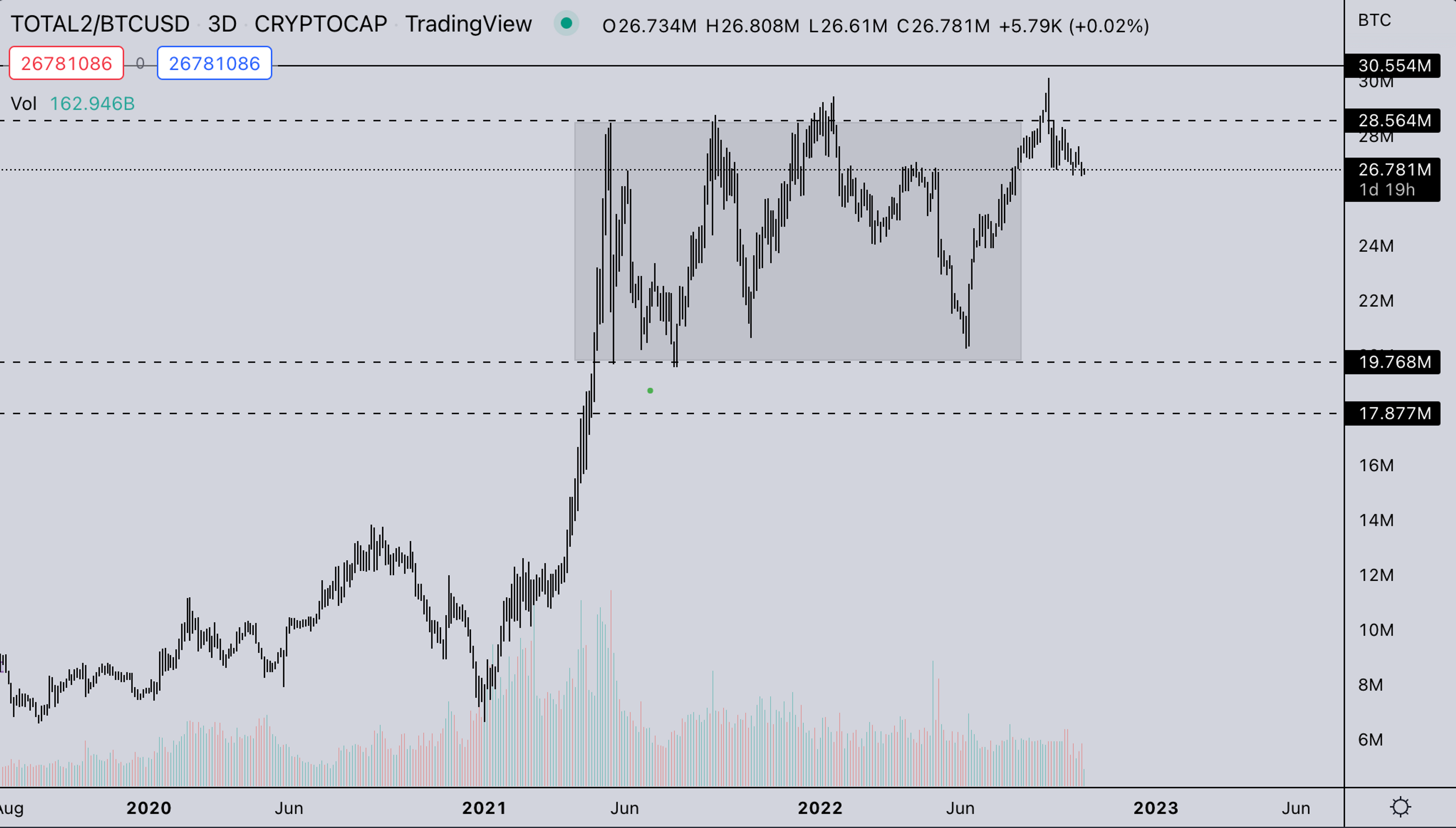 - ETH/BTC has formed a tight range on this consolidation's midrange point (0.067). With the relative strength of ETH, there’s quite a high probability that this rotates upwards back to the highs & hopefully finally clears the entire price structure.