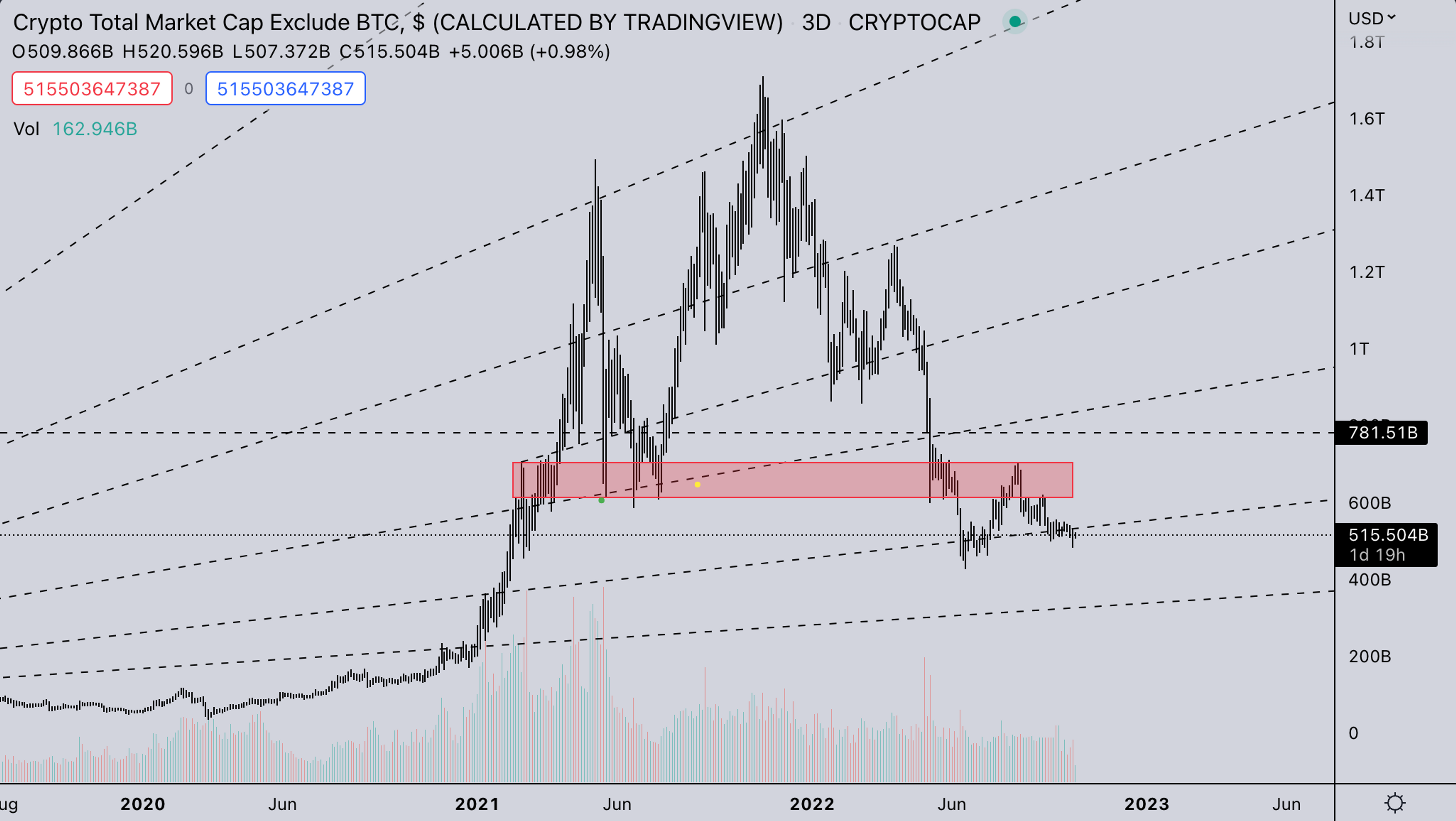 TOTAL2 is currently under the 2021 support, and below are trendlines. With what ETH/BTC shows, there’s likely a continued weakness because of a strong dollar in dollar valuations. But from what the market shows, there is underlying strength in ALT/BTC, given that ETH/BTC can make a move higher.