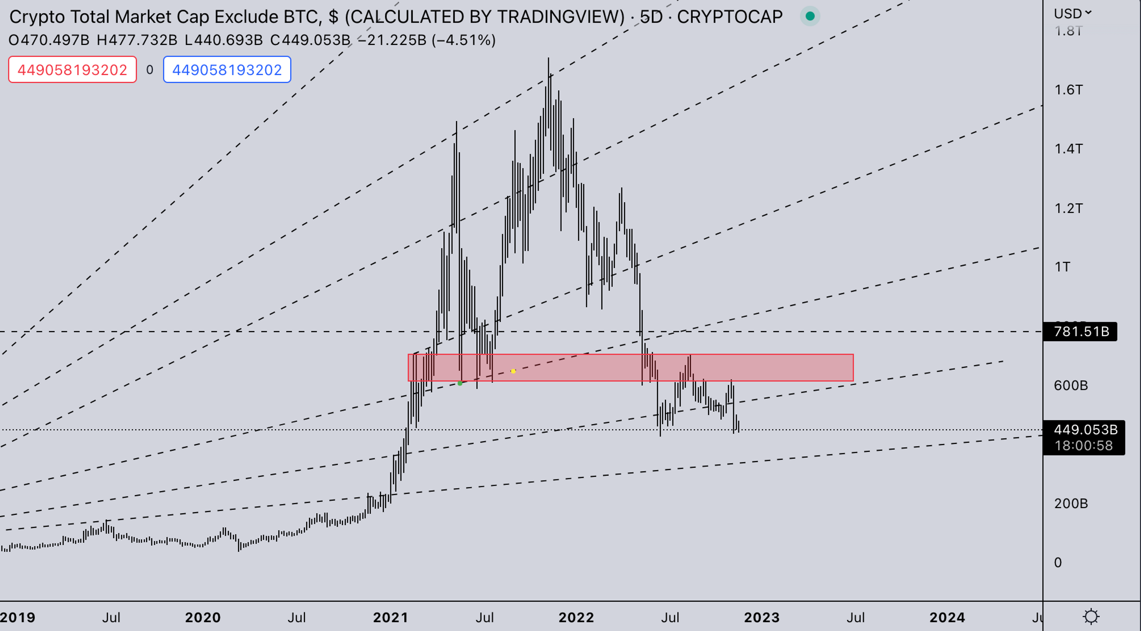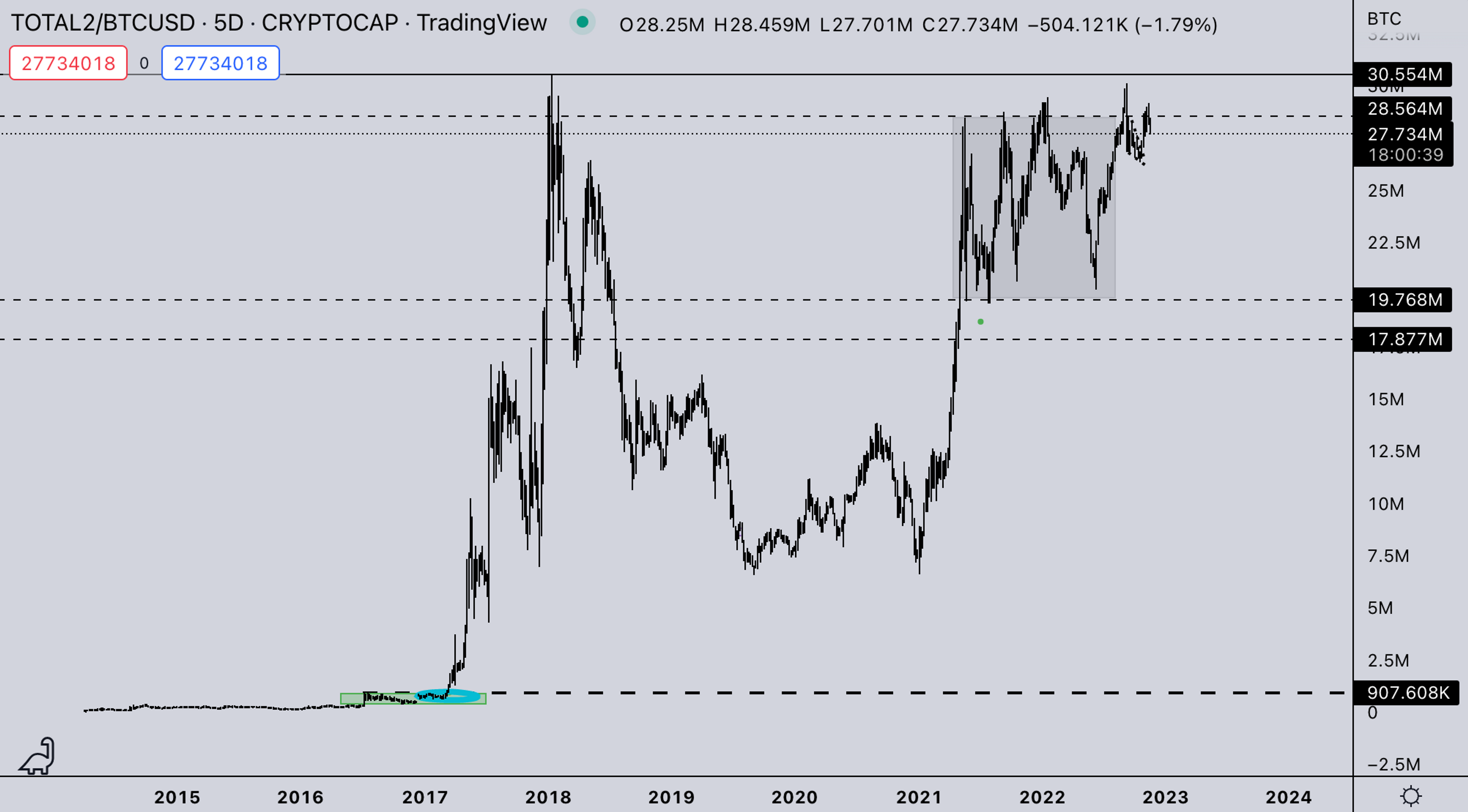 USD valuations are weak, with BTC being weak. TOTAL2 will absolutely go lower if BTC fails current levels. The expectation would be that TOTAL2 bottoms somewhere 350B area. Giving ±30% downside on the entire alt market.