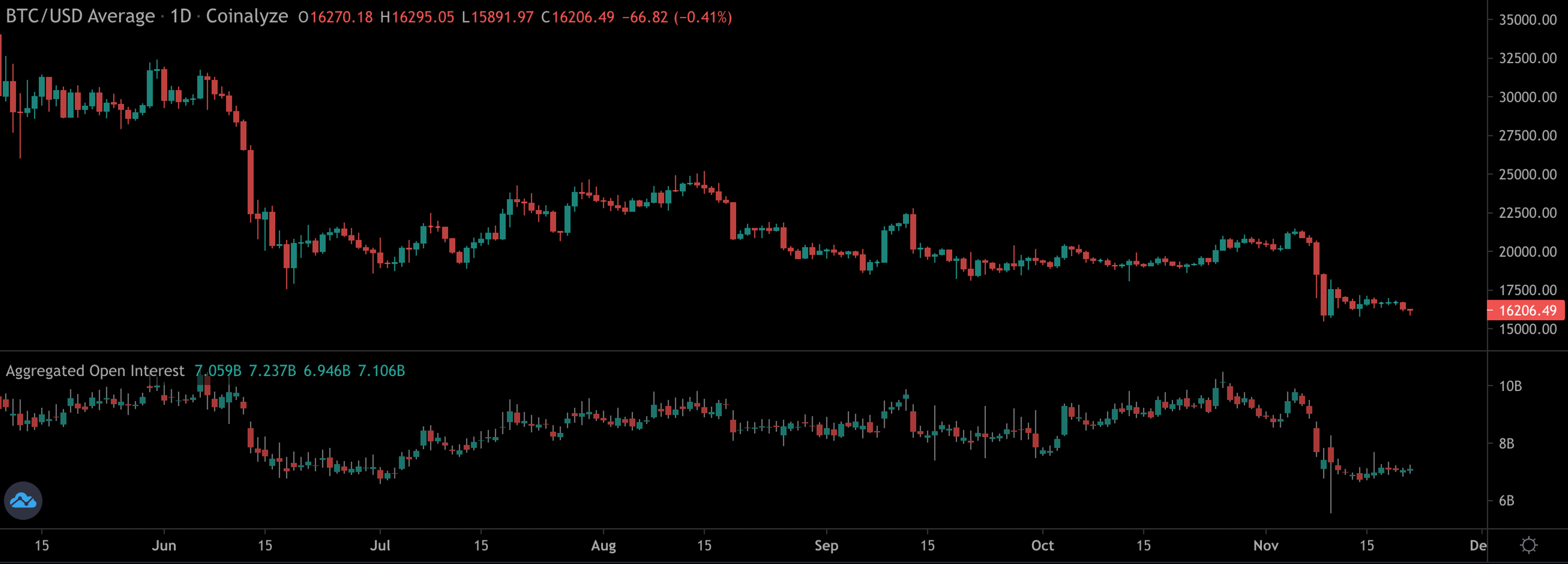 OI hasn’t changed much the 3B drop in OI is mainly FTX OI going to zero. There isn’t a whole lot of leverage on CEXes, but as we’ve seen numerous times now, there is a lot of leverage behind the scenes between crypto companies.