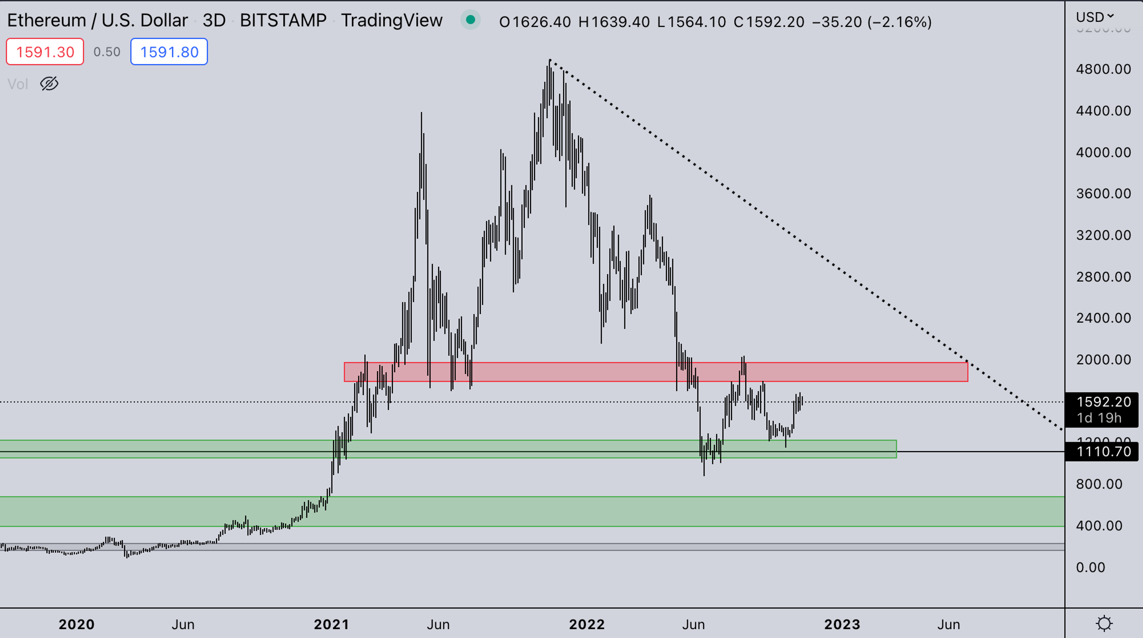 - ETH is relatively stronger. Again consolidating just under the 2021 lows. Most likely, ETH will retest the 2021 lows leading to a probable upside of around 2k.