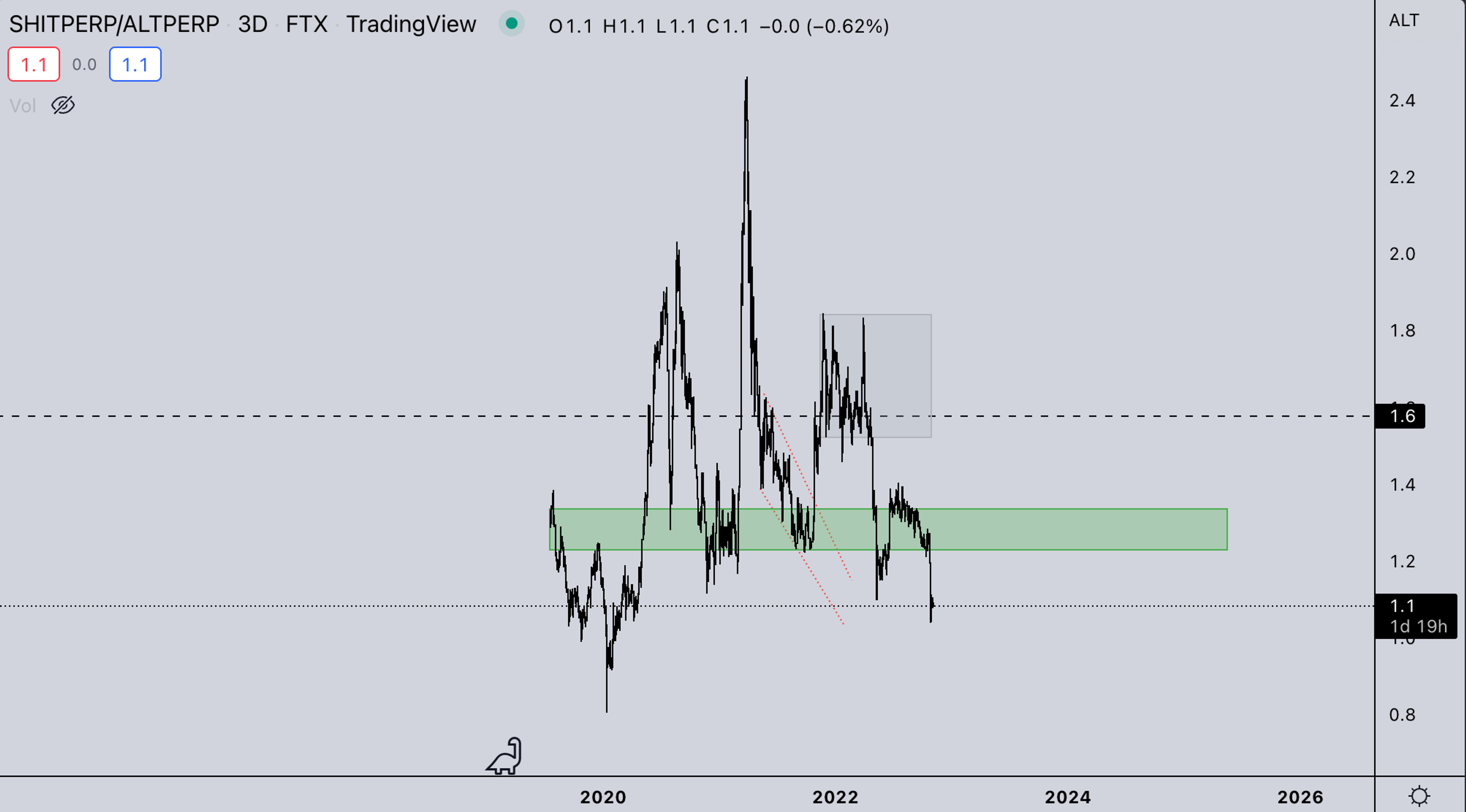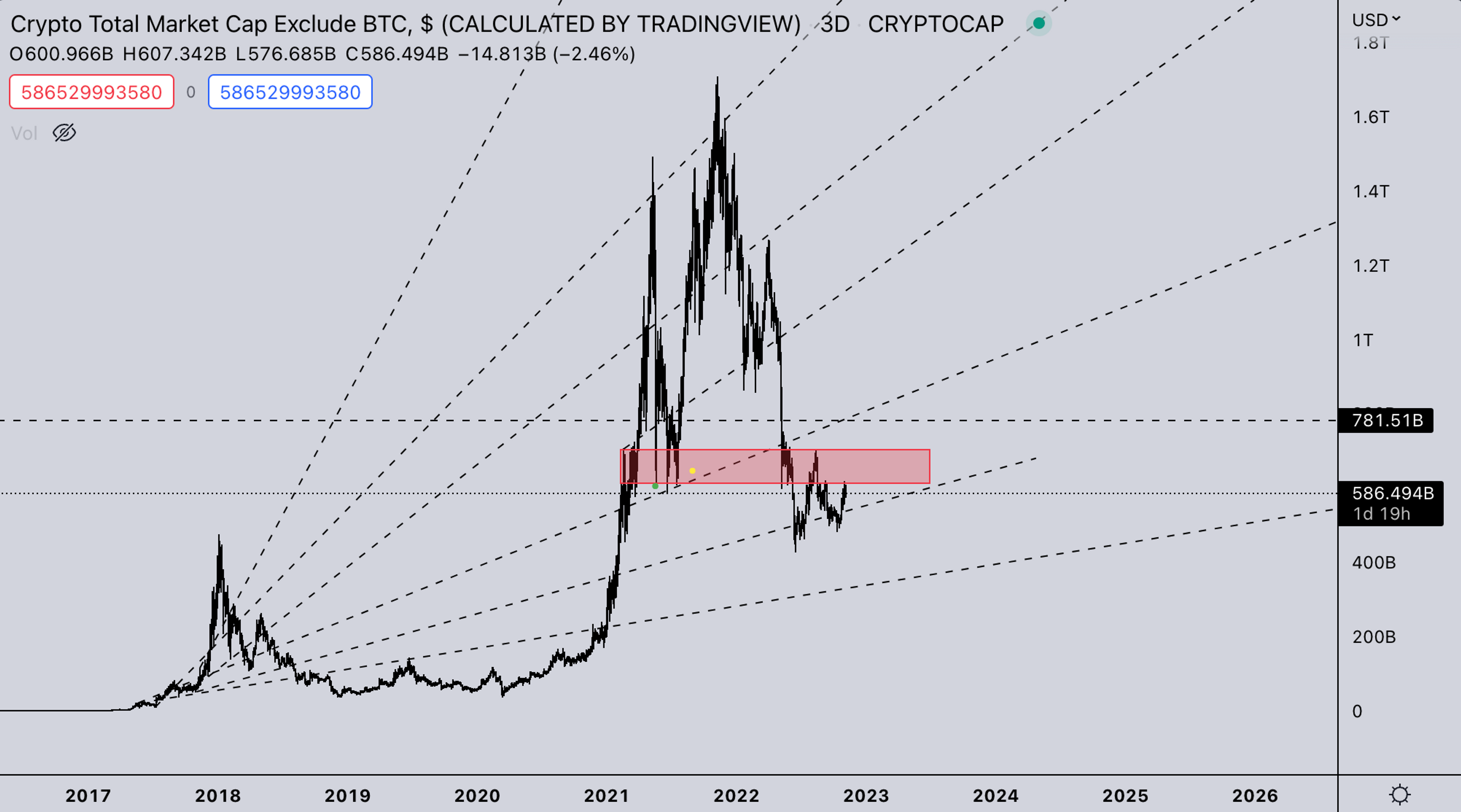 TOTAL2 is also back at the 2021 lows. With this being a major area of resistance, there will likely be some weakness in dollar valuations. With ETH/BTC being back at structure highs, a breakdown in BTC lower would most likely lead to a breakout in ETH/BTC. A breakdown in BTC would also lead to TOTAL2 getting another rejection here.