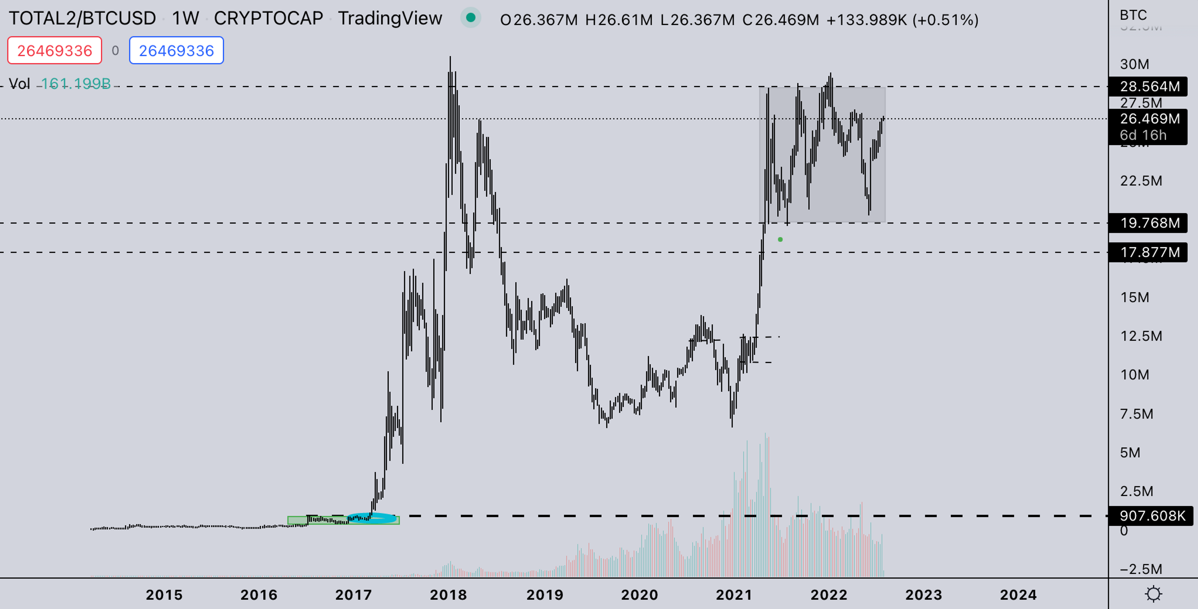- With ETHBTC catching strength and TOTAL2BTC likely pushing ATHs soon, there’s a fairly high possibility we’ll see older major coins run on BTC pairings as soon as ETHBTC gets above the 2021-2022 price structure (Over ±0.09).