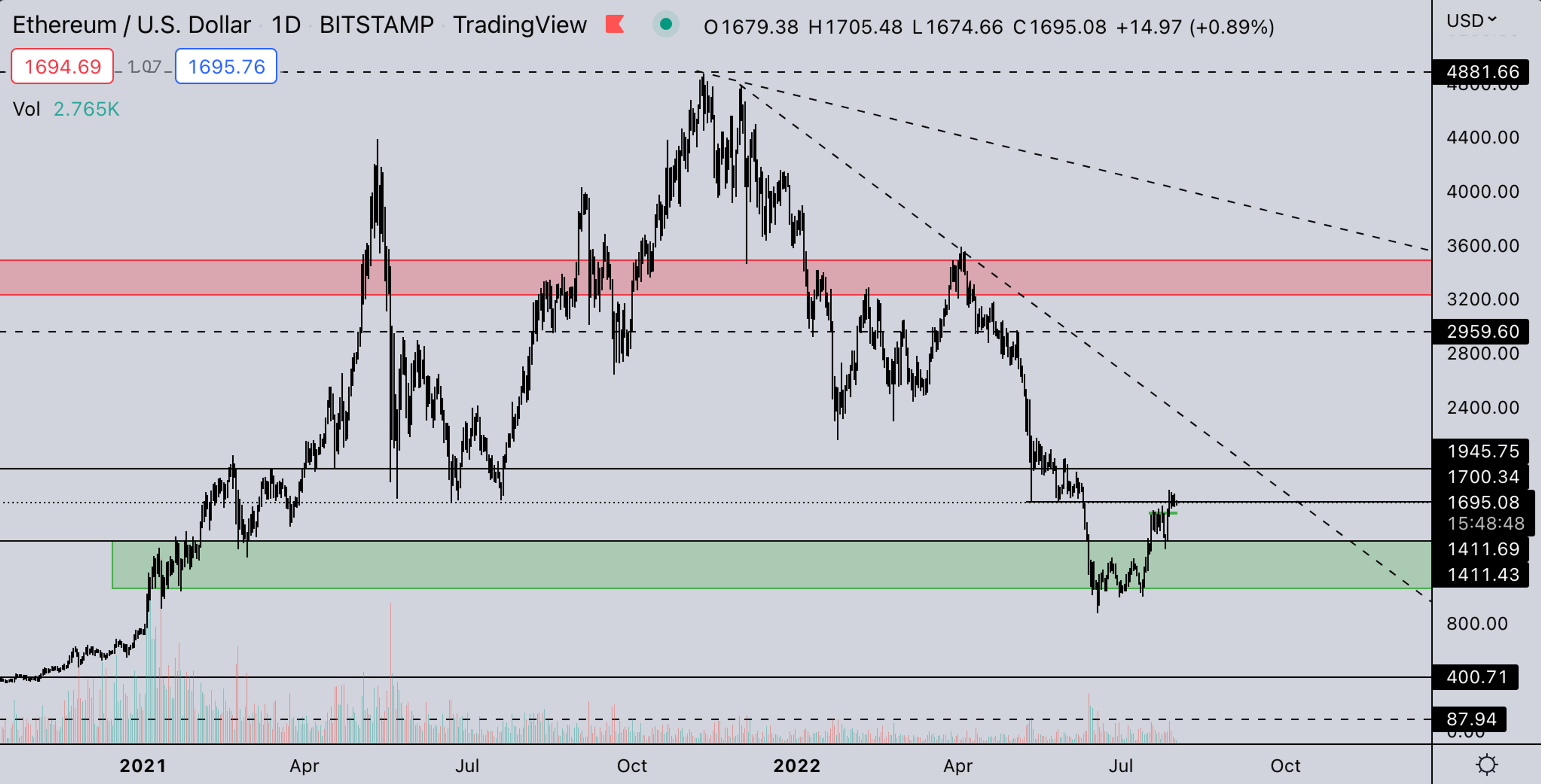 - Where BTC couldn’t even get to the LUNA crash low, ETH is consolidating right on it. Not to mention for ETH, this is a fairly large area as it’s not only the LUNA crash low but also the summer 2021 crash low/bottom. From a price point of view, it's a fairly large wick area over 4 times around 1.7k. The chances of getting some rejection/stalling are high as these high-volume areas generally take time to reclaim.