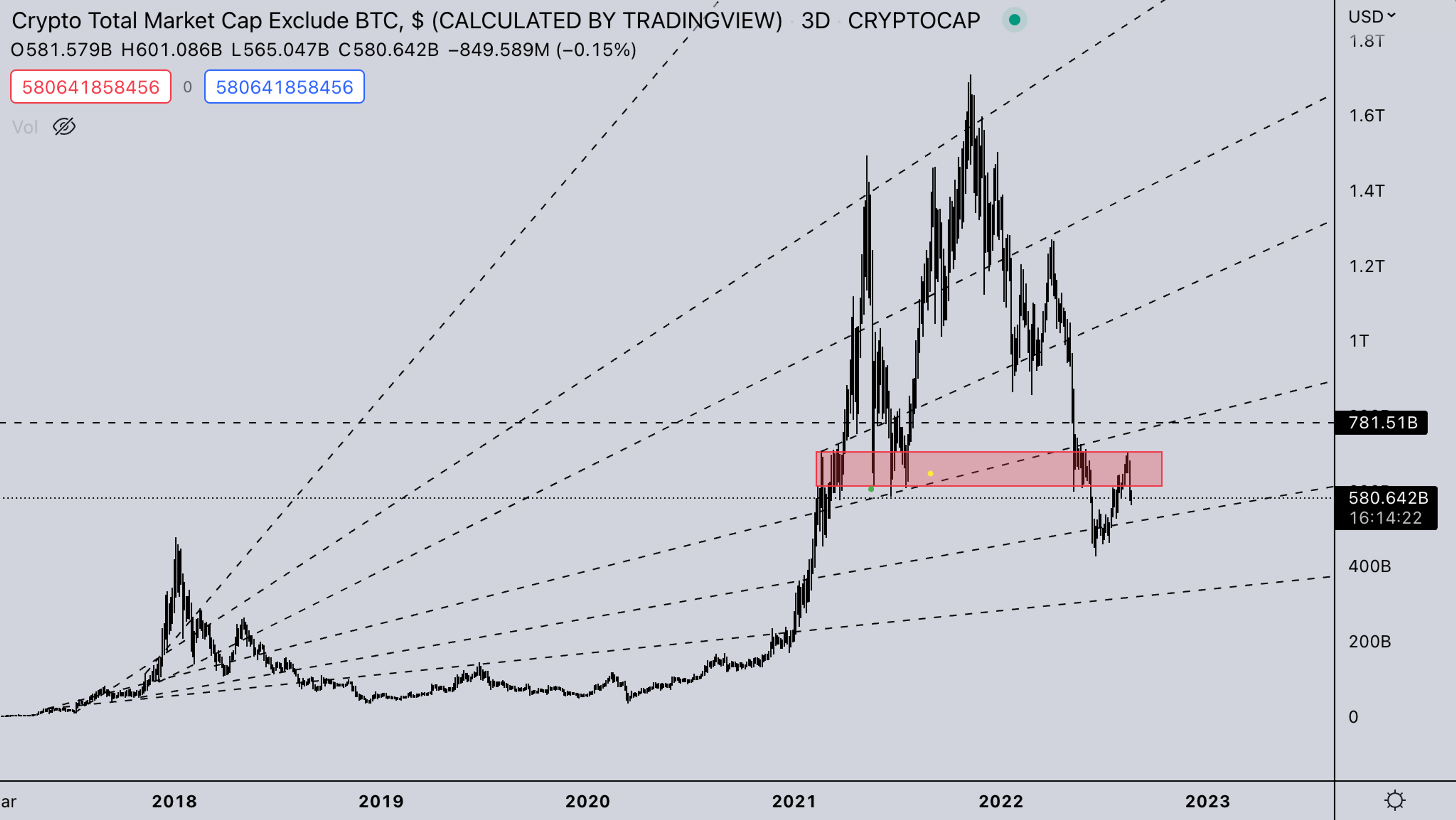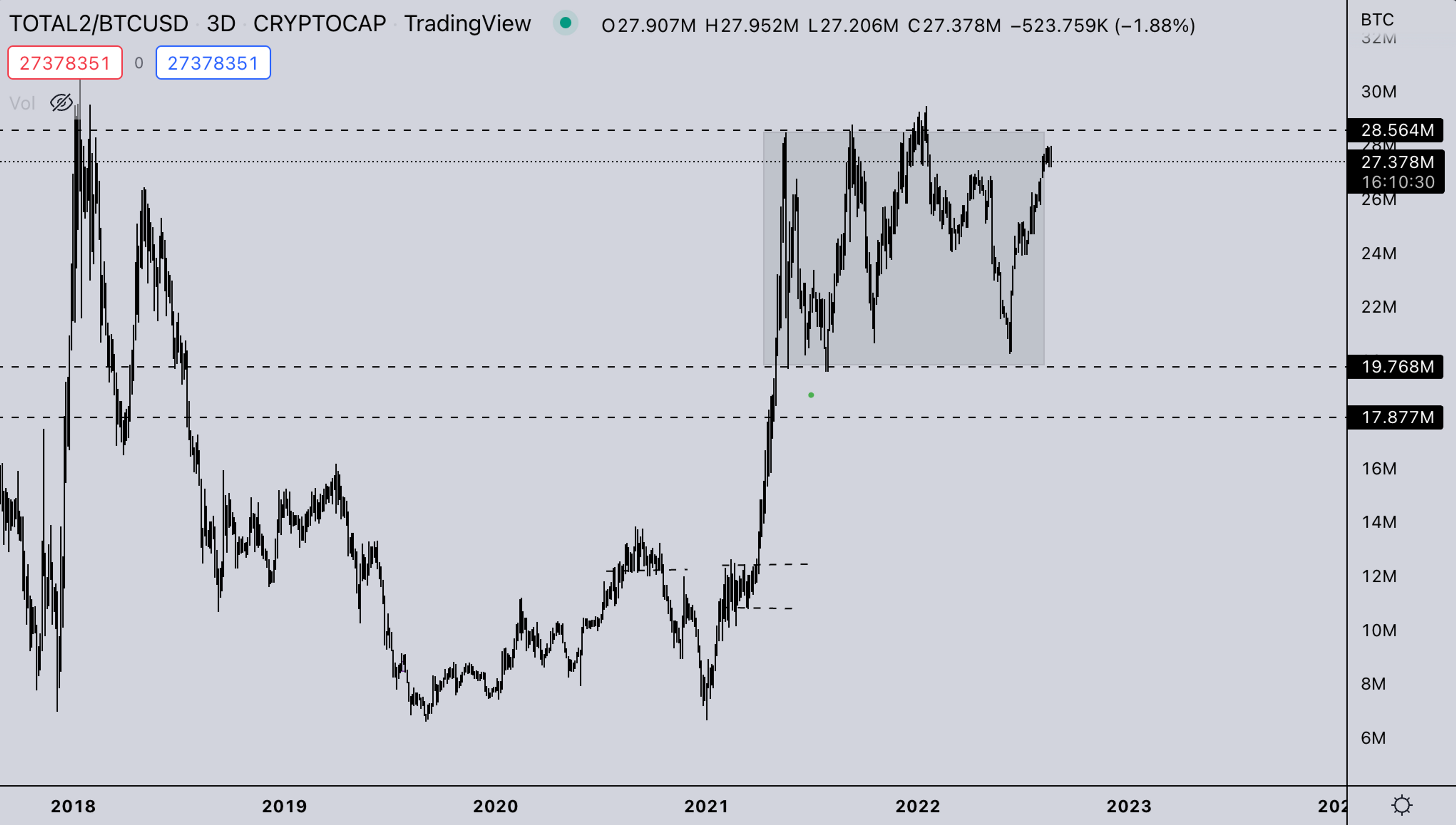 TOTAL2/BTC is painting the same picture as ETH/BTC. We will most likely see it correct out until BTC finds a new floor from which altcoins will run faster. This will be the first time since 2017 that the TOTAL2 ratio breaks highs. This can lead to a fairly long-duration rally against BTC.