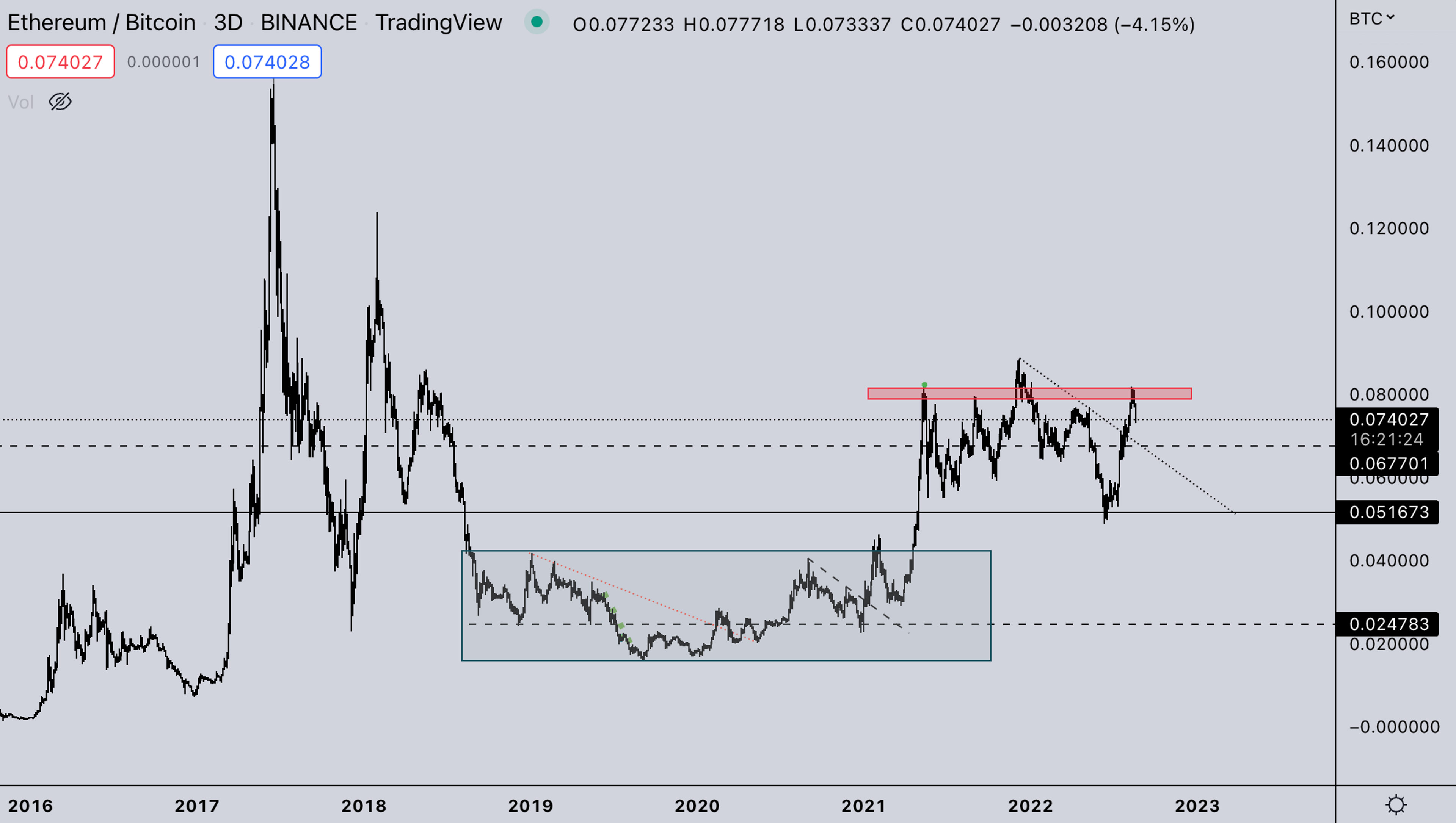 After a significant low surge, ETH/BTC traded upwards for several weeks. With it finally slowing down in the .08 region. With the upcoming merge and supply reduction, this is likely just a corrective counterwave before ETH/BTC marches higher.