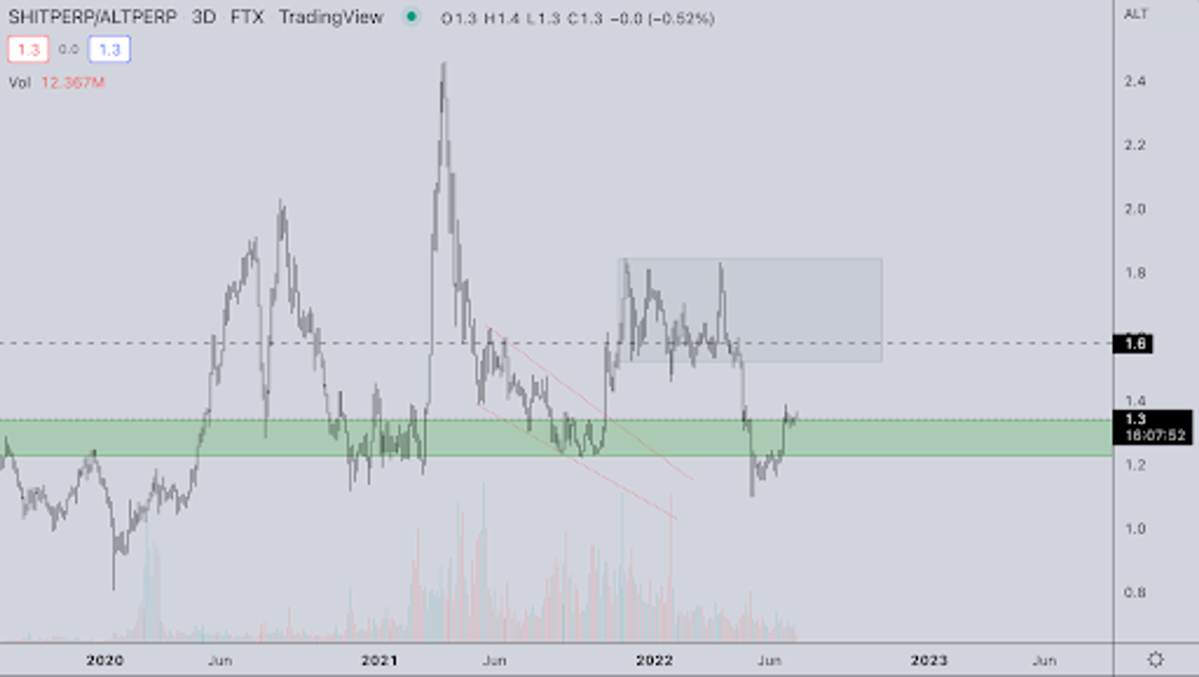 SH*TPERP is also showing relative strength against higher caps. This shows that our assumption of a possible underlying alt strength might have legs against BTC and ETH.*SH*TPERP/ALTPERP is a measure of speculative risk. When SH*TPERP outperforms ALTPERP, it shows a measure of speculation in the market, which shows how much risk people are willing to take at a certain time.