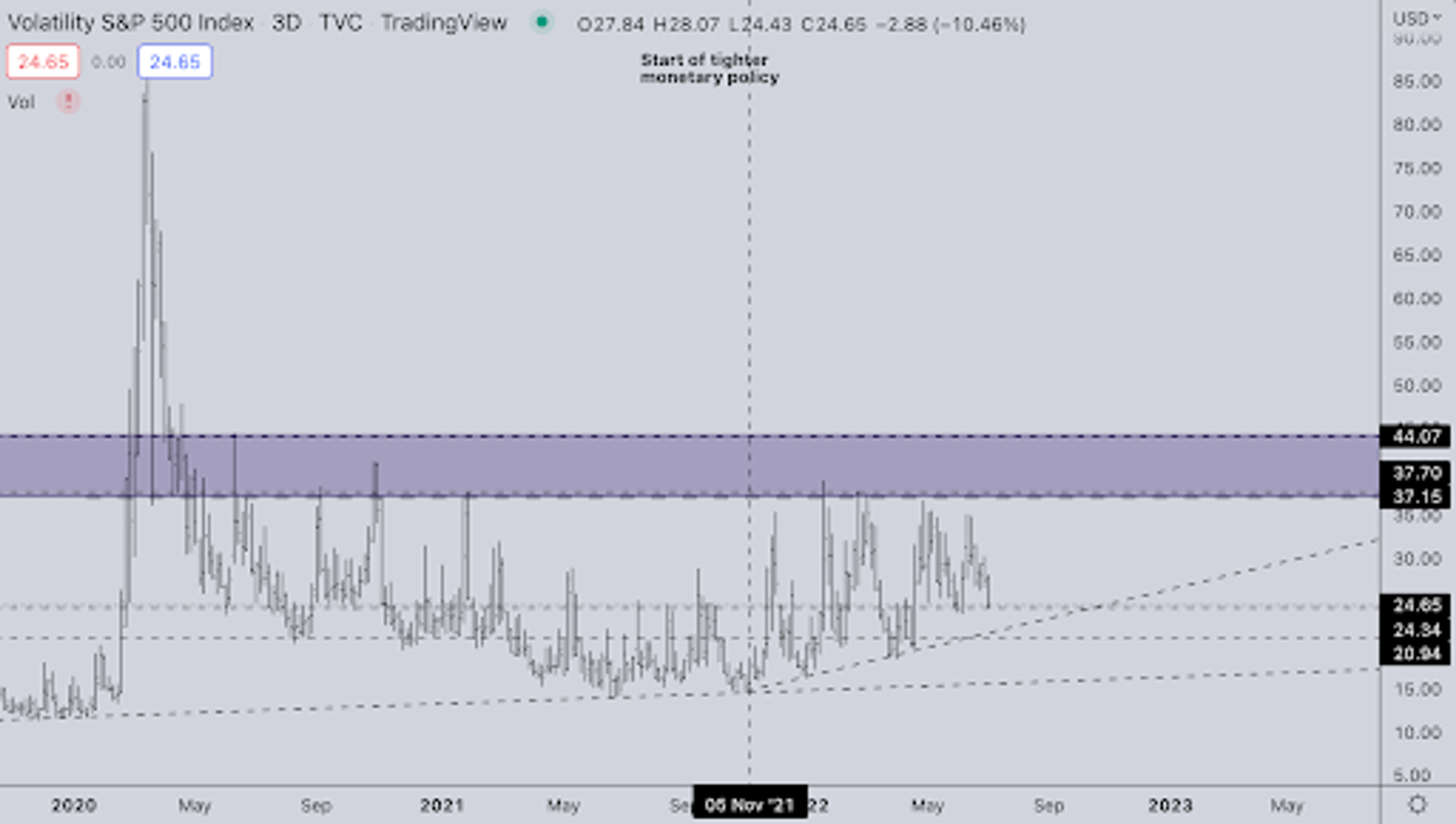 - Last week VIX closed at its lowest in quite a while, under 25. This morning it gapped up over 26, which was quite expected with BTC selling off to the low 20s over the weekend as an early indicator for risk asset weakness.