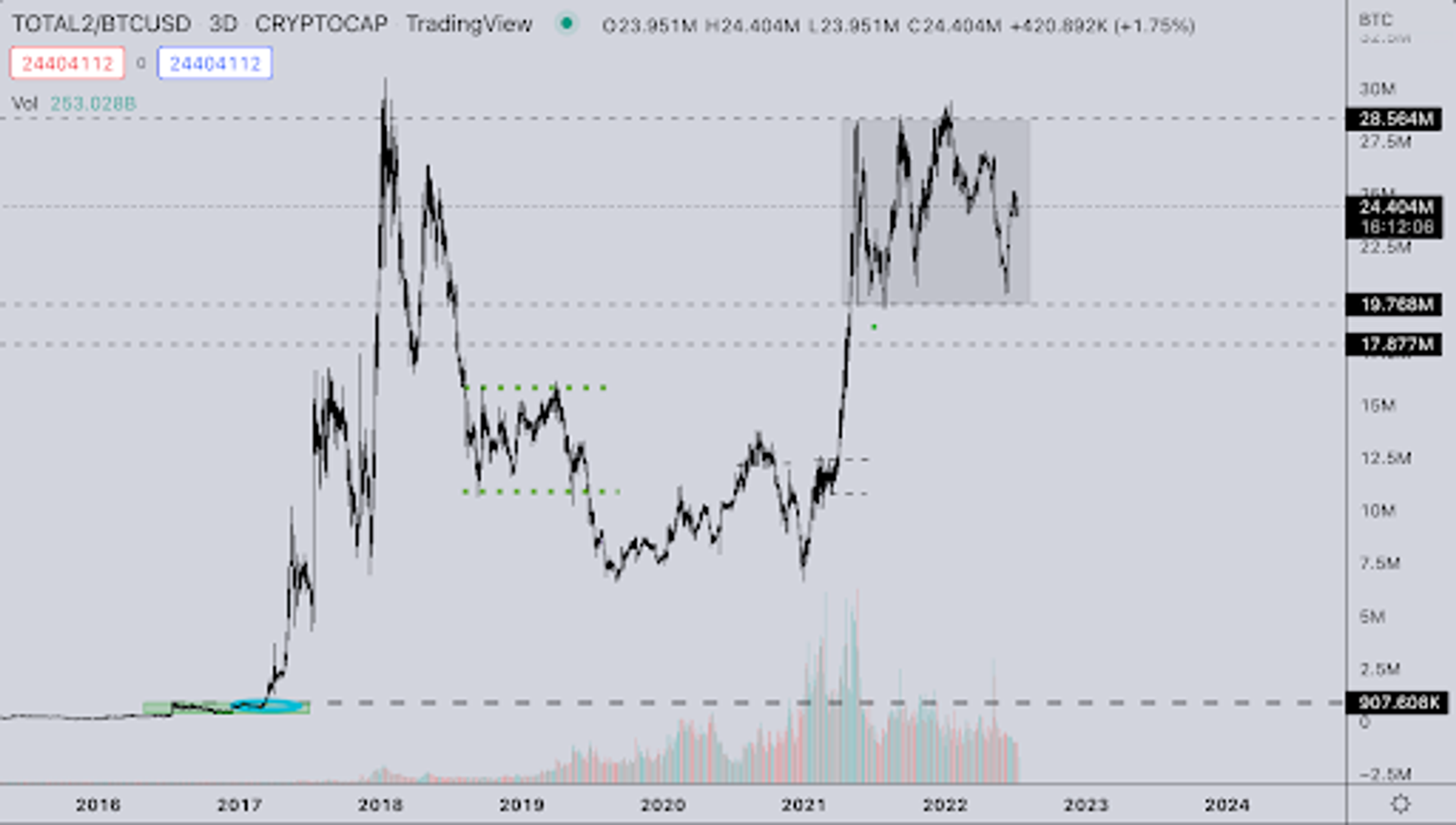 - After the BTC implosion, TOTAL2BTC has shown initially surprising strength. But with it never breaking the 2017 ATH at peak valuations, it could make sense that it goes for new highs at current BTC valuations while excess BTC collateral gets distributed into the market.