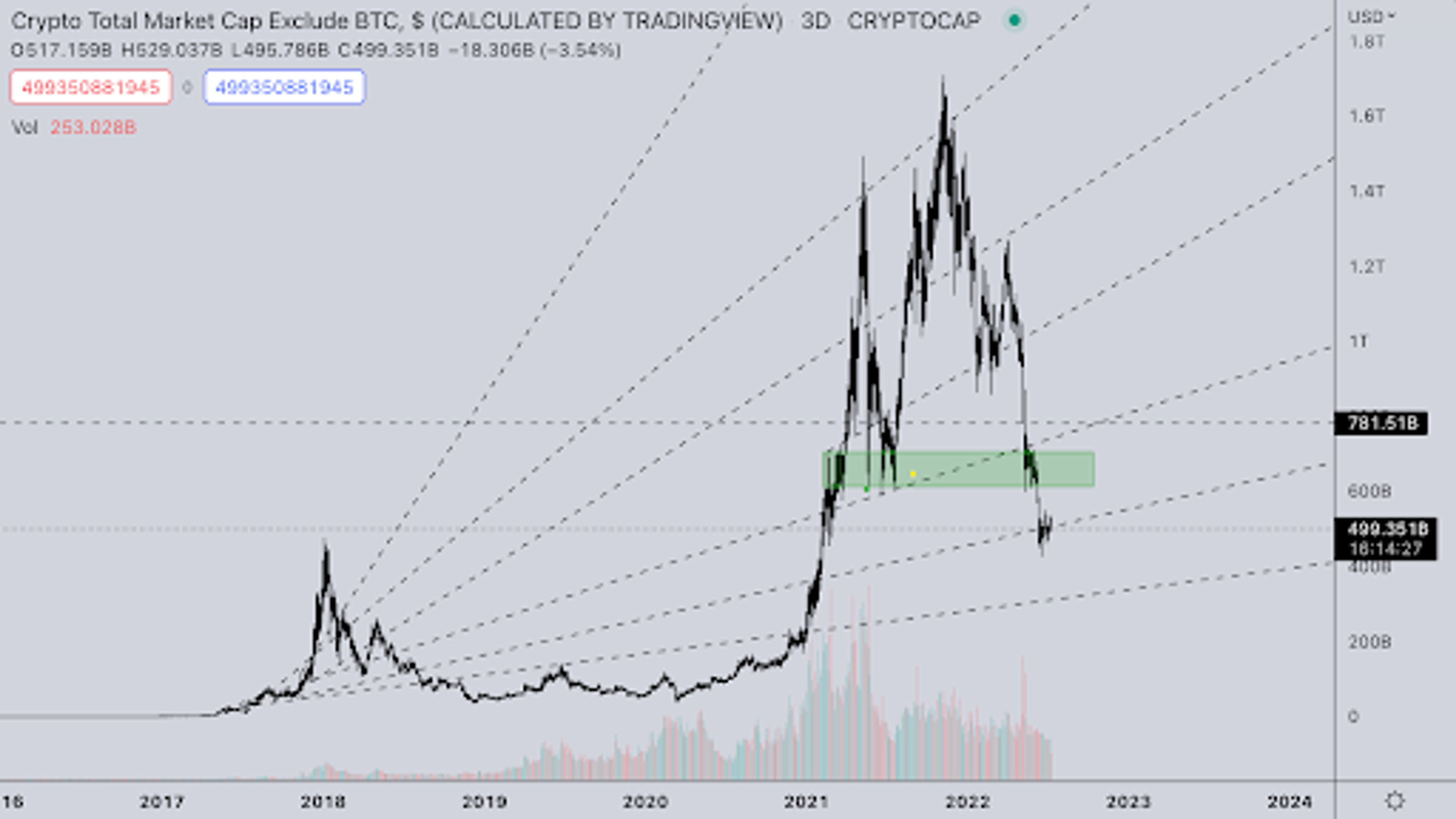 TOTAL2 resembles the same picture as everything else. Currently consolidating on 2017 ATH. With ETH and BTC still being caught up in possible unwinding, it makes sense for some alts to rally vs ETH & BTC. We’ve seen these effects initially with coins like SOL, MATIC… gaining more than 50% against both.