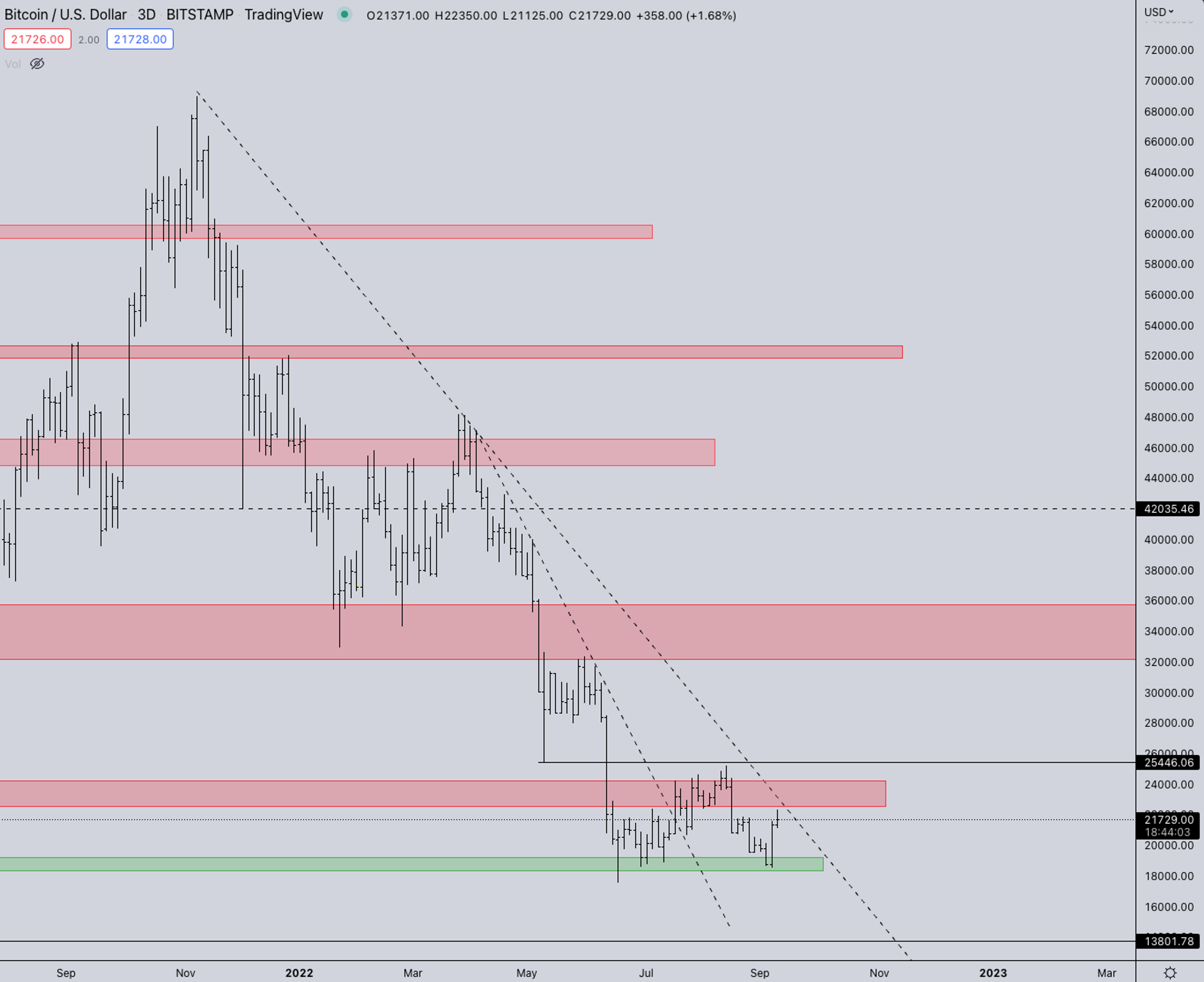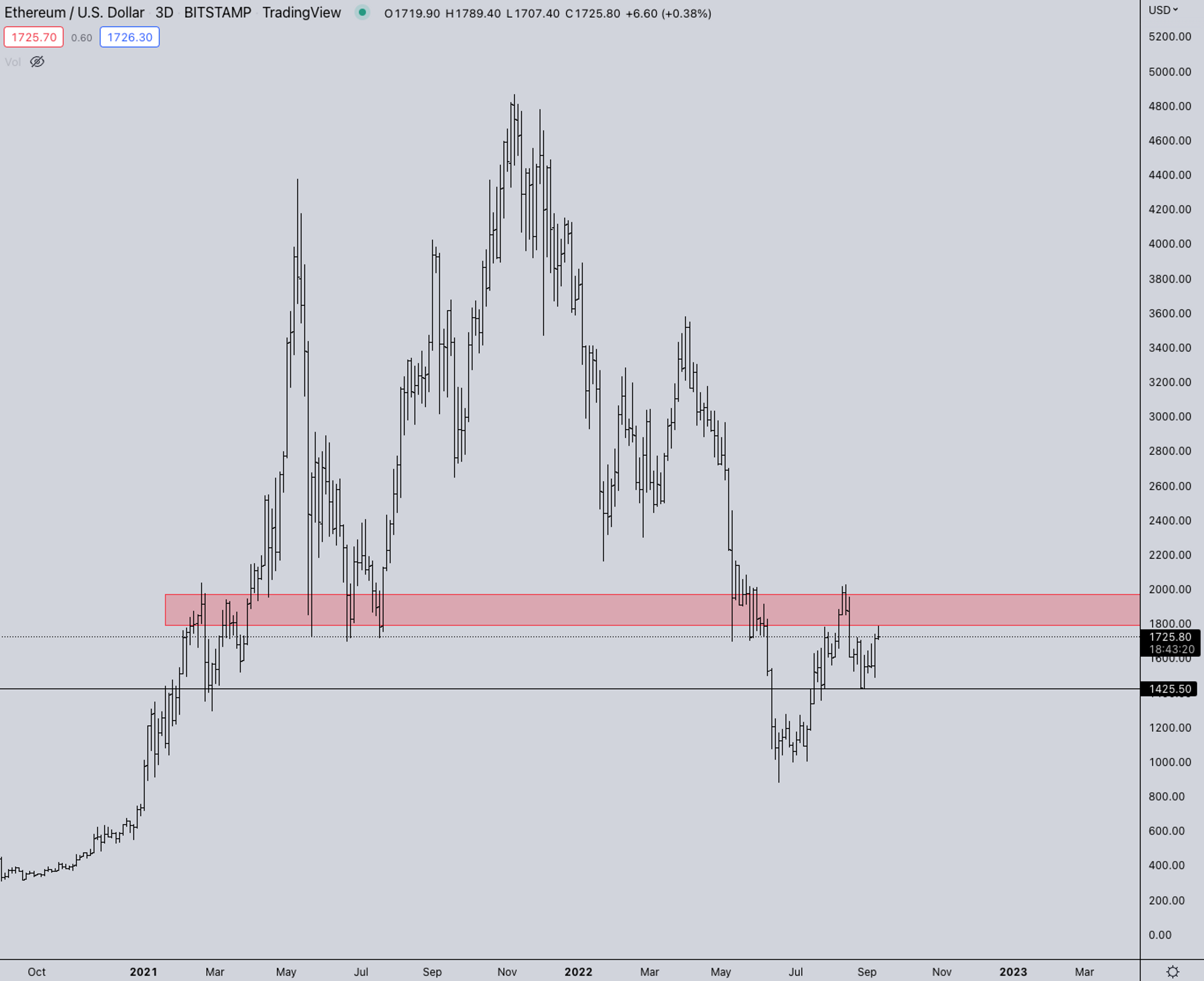 - BTC is still ranging as can be seen between the green and red box. BTC currently doesn’t have any large narrative going for it. That said if the S&P continues higher this week and the market gets a lower CPI number and successful merge.