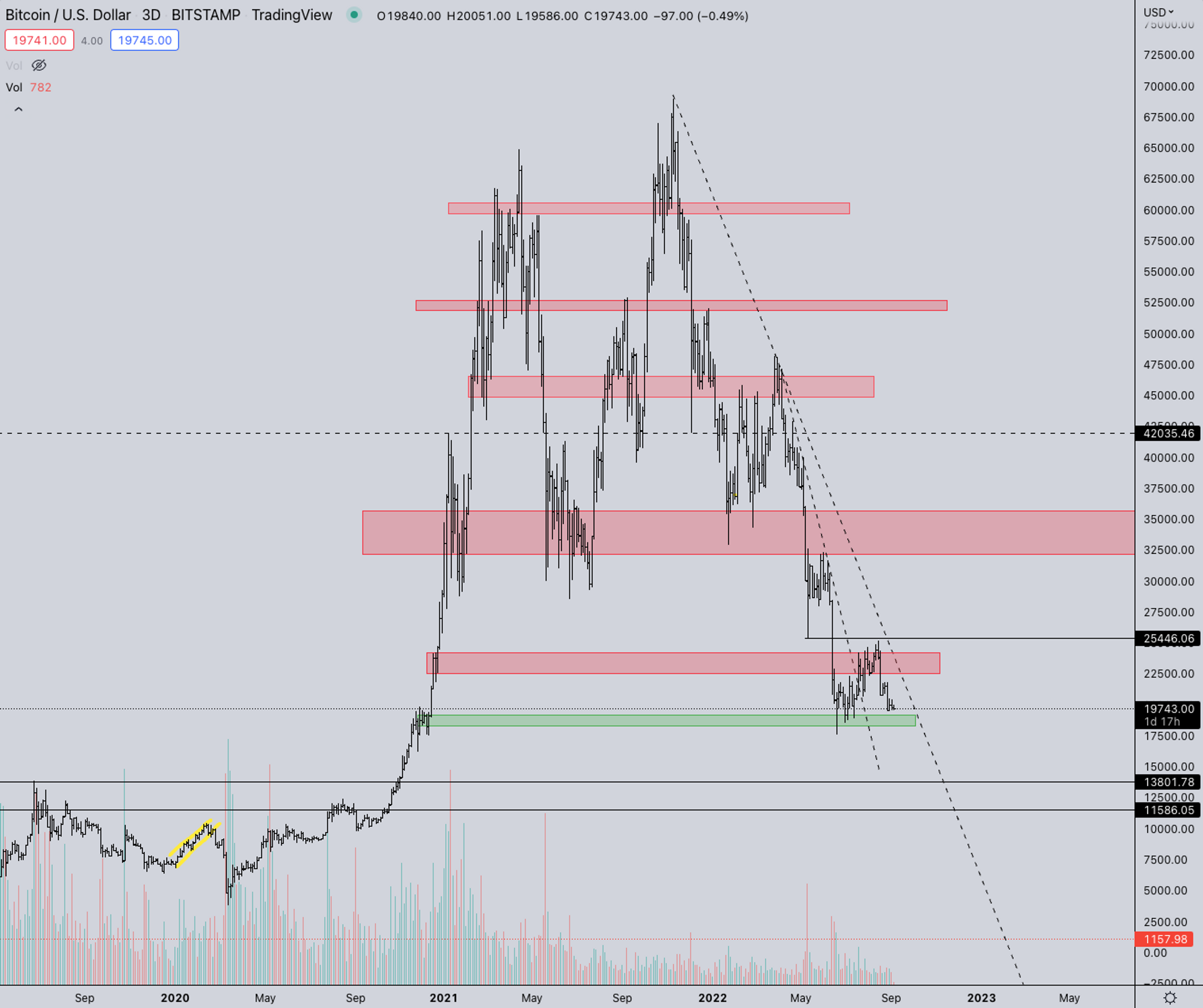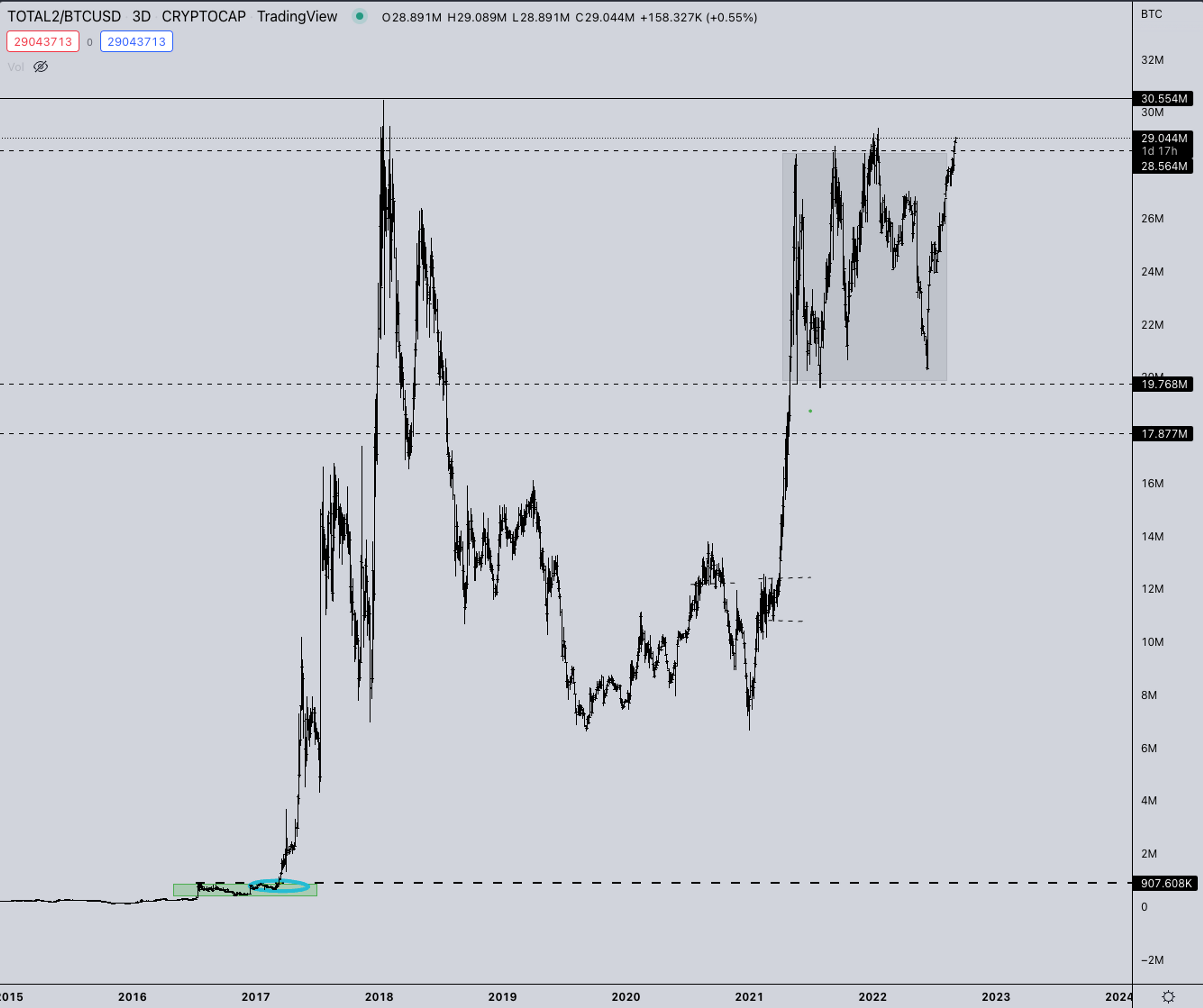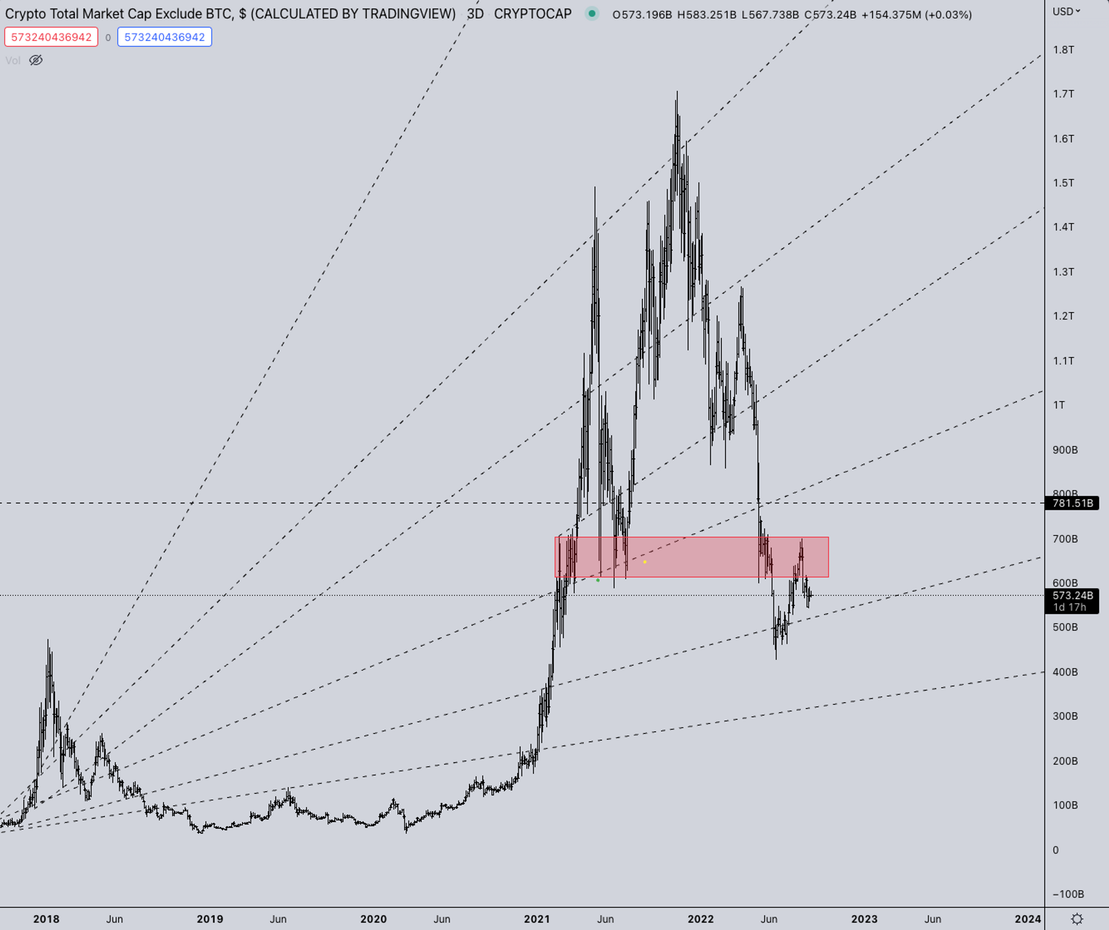 TOTAL2 is also still building a price structure under the 2021 support area. Given the magnitude of these structures in dollar value, it could range here for multiple weeks or even months.