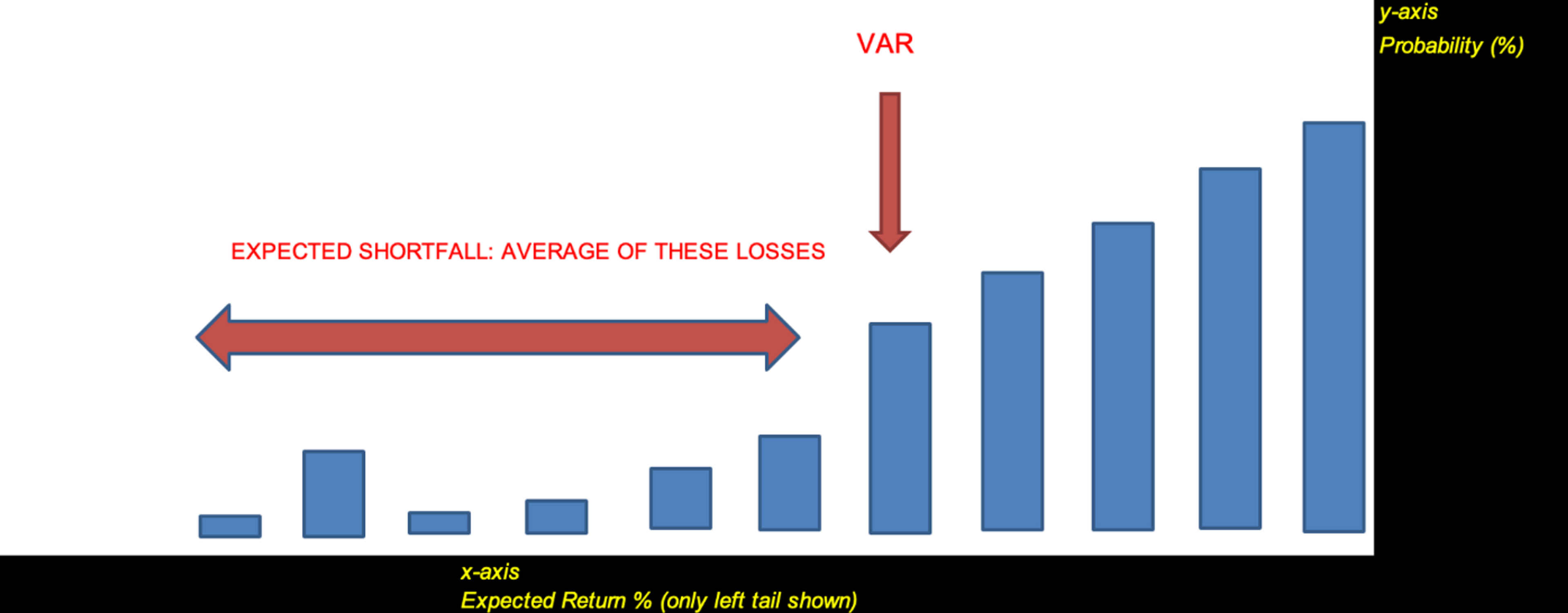 One of VaR’s weaknesses is the inability to capture “tail risk”. An alternative metric (ES) has therefore emerged, which measures the riskiness of a position by considering both the size & the likelihood of losses beyond a certain confidence level. In a nutshell, think of ES as the expected value of these losses beyond a given confidence level. So while we understand that VaR is the loss that is expected to be exceeded (100 - X) % of the time in N days for specified parameter values (X & N), ES is the expected loss conditional that the loss exceeds VaR. For example, if X = 99% & N = 1 day, ES is the average amount that the portfolio loses over a 1-day period when the loss is (already) in the 1% tail of the distribution.