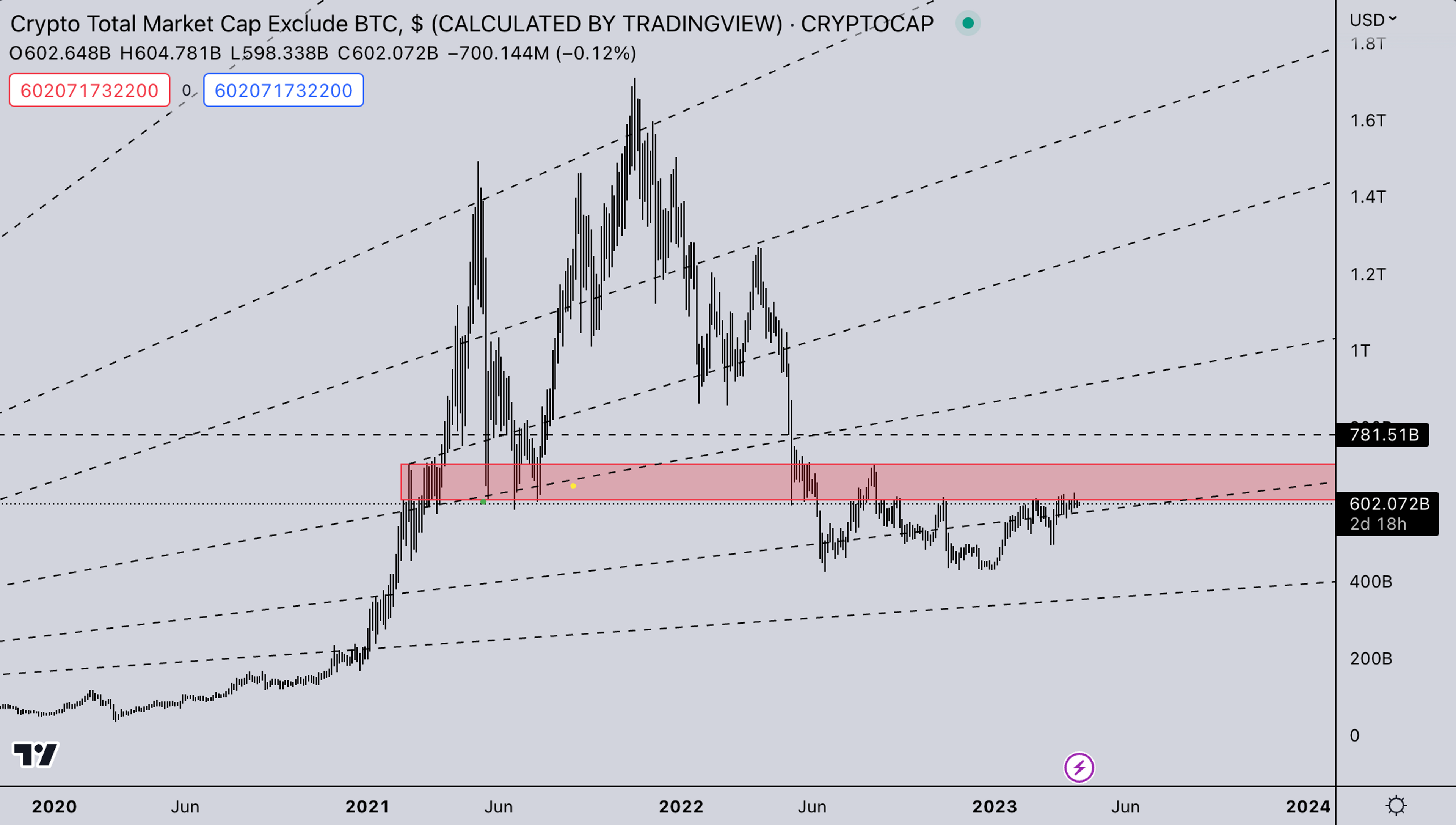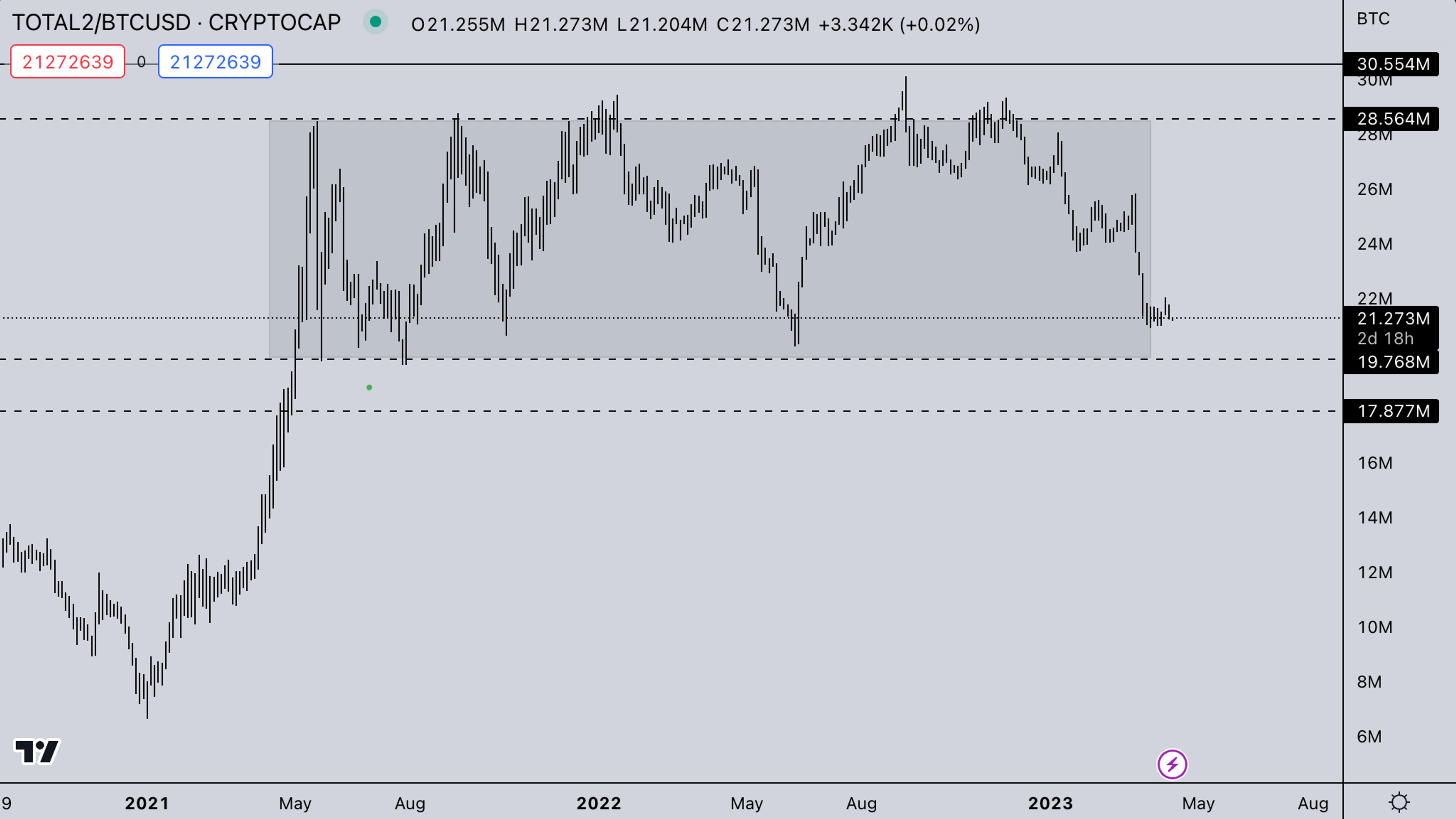 TOTAL2/BTC is likely to continue a weak trend if total liquidity in the crypto market doesn’t improve, and the flow from alts to majors will likely continue if the market consolidates, recent L2/new chain and NFT aggregation tool narratives need a better macro condition to help alts thrive.