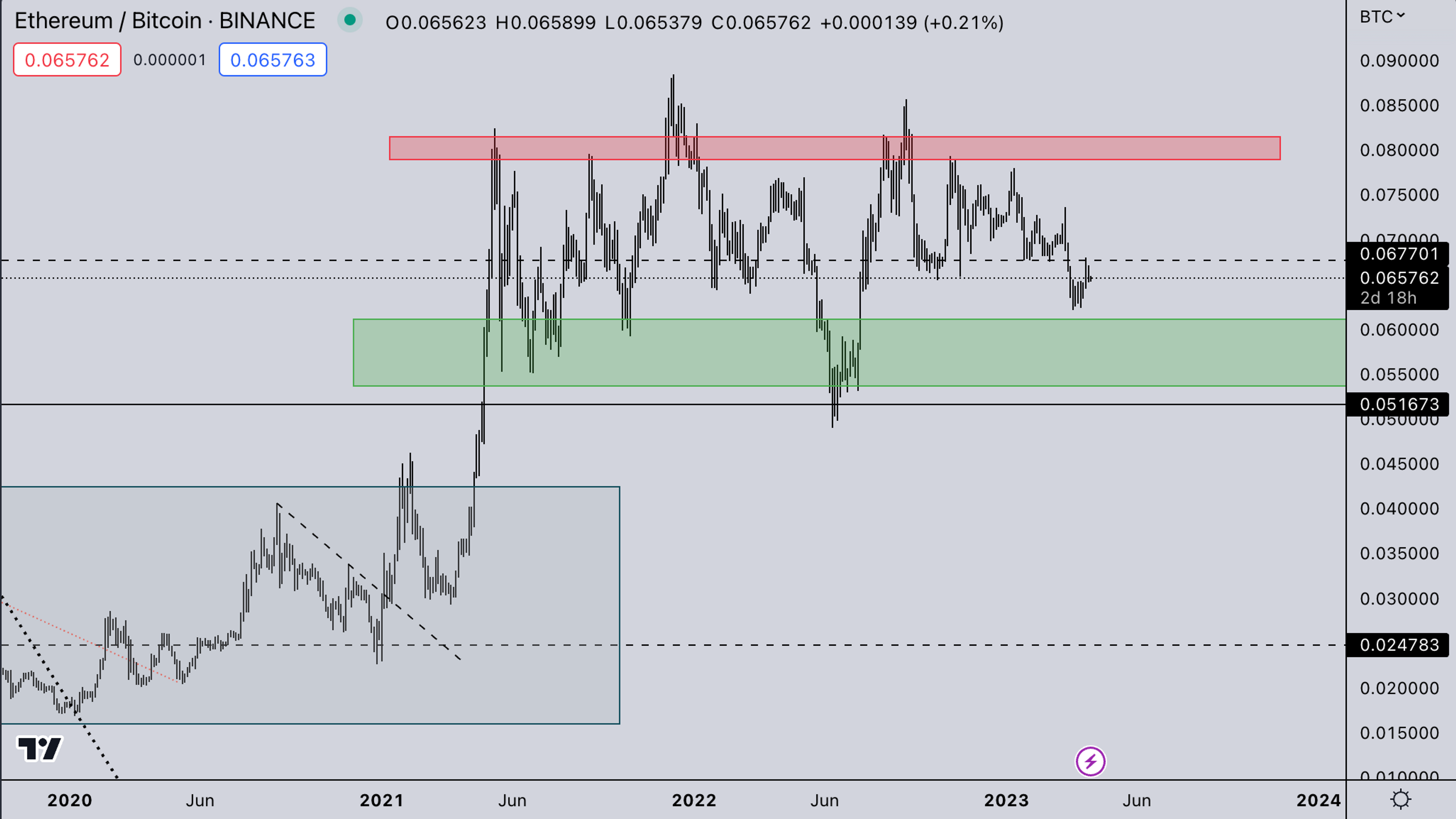 ETH/BTC rate is likely under pressure this week given how large the ETH selling pressure might look like, short term support is at 0.06 level with mid term support at 0.05 level.