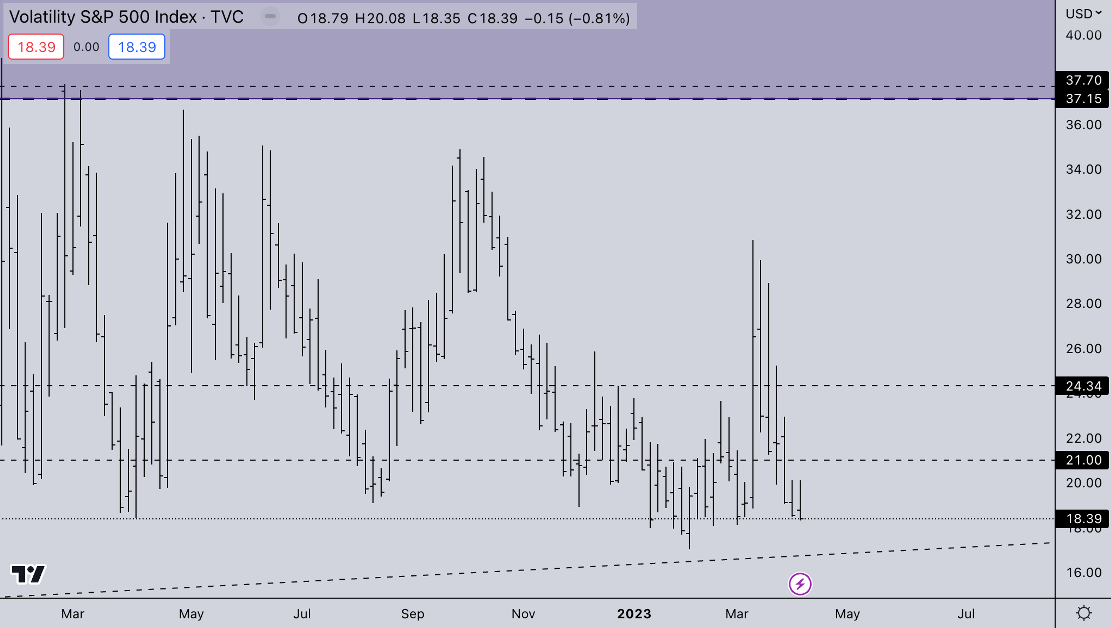 VIX level continues a downtrend after the banking liquidity crisis for 1 month with recent macro data mostly in line, but likely pick up a bit this week with speculative positions on CPI numbers as well as Shanghai upgrade in crypto. Without large Fed policy change, which is dependent on the economy's slow pace, any volume-up move is likely to be sold into.