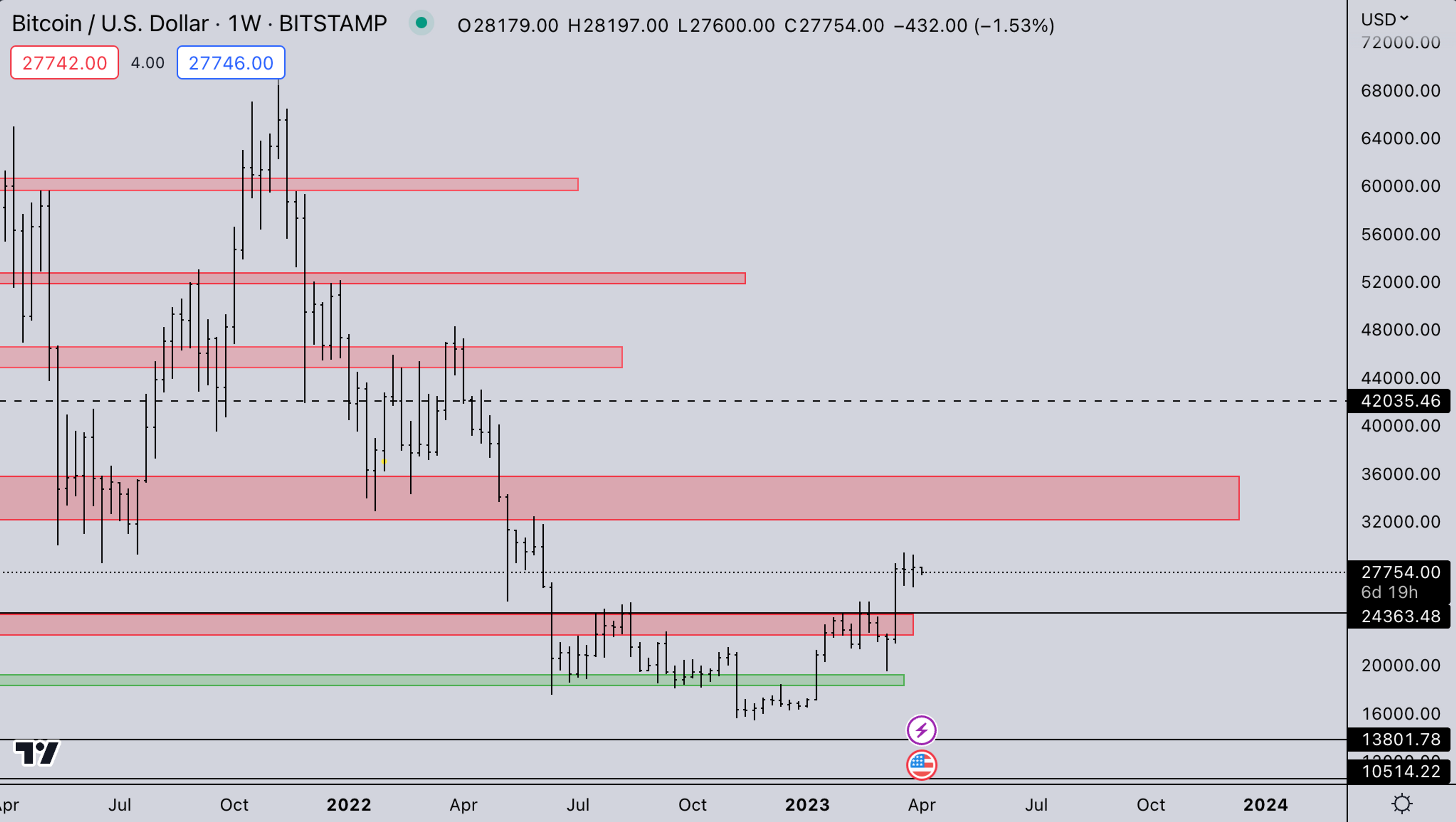 BTC seems to be between the 20k-30k in range, if you look at the big picture. In summer 2022, ETH saw a similar chop price action right under the 2021 floor, which BTC is now experiencing. Althought it still shows a similar characteristic as that of Gold or Nasdaq. For now, breaking above 30k would probably cause a huge fomo in the market. We think it’s highly unlikely, that a break above 30k would be sustained. It appears to be more likely a fakeout (if it happens), to lure in participants that have mispositioned since the lows.