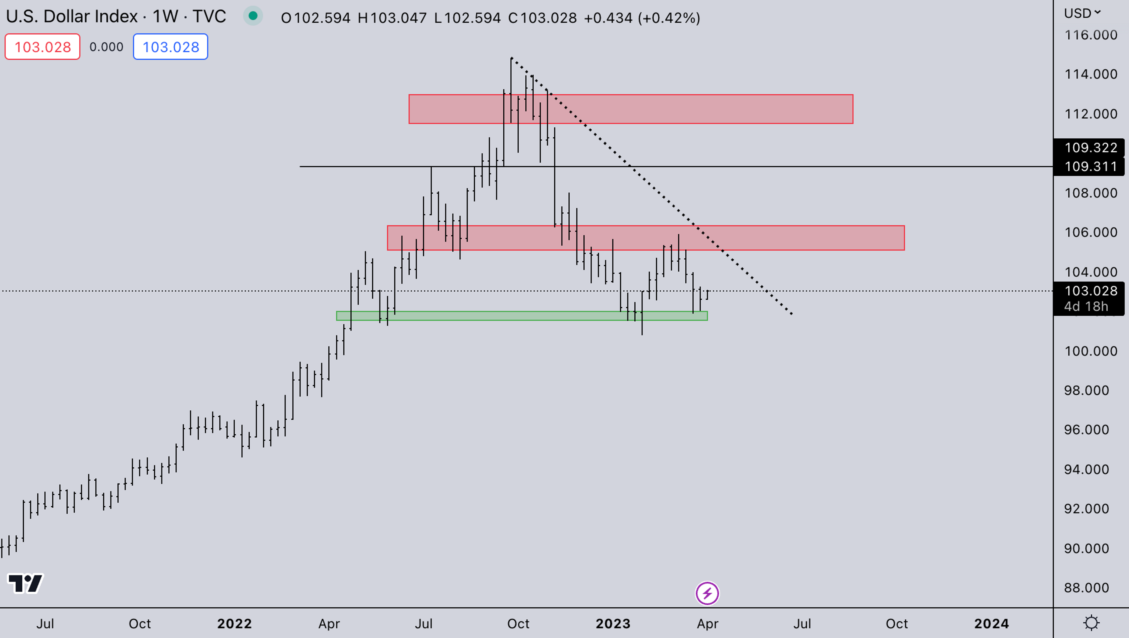 DXY tested range lows and holding. The extreme negative sentiment around the $ Dollar in the market seemingly gives a bit of strength for crypto in the long run. Although, this would put pressure on equities and crypto in the short term. Zone of interest would be up to the 106 area as a starter, but below the green zone would likely make crypto exceedingly bullish.
