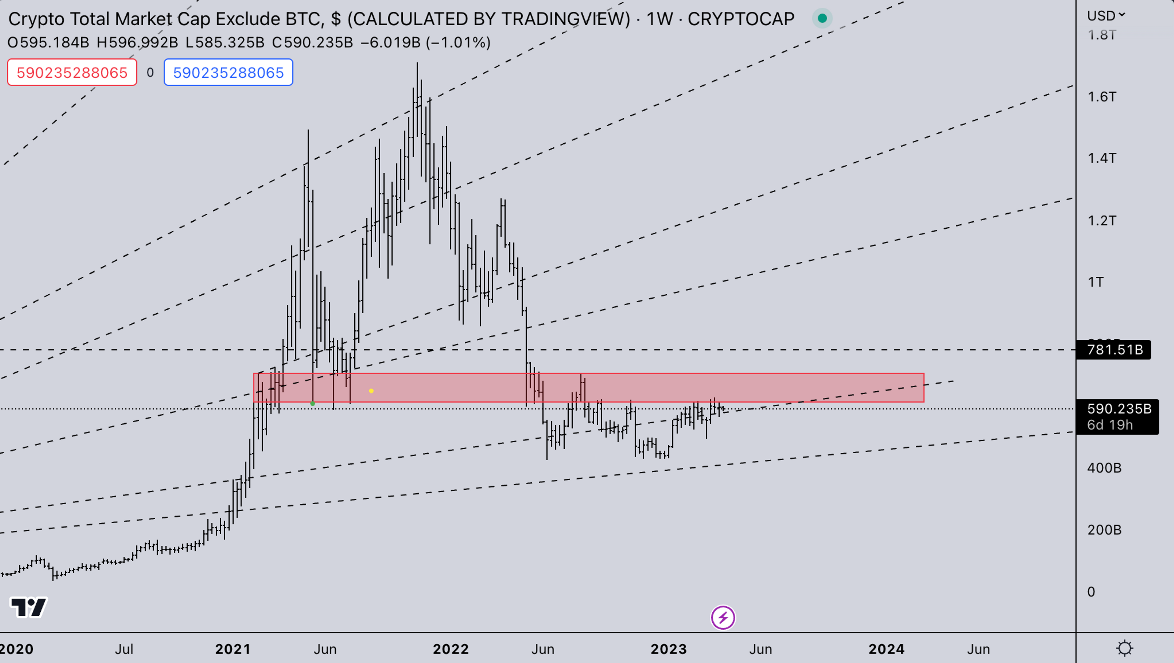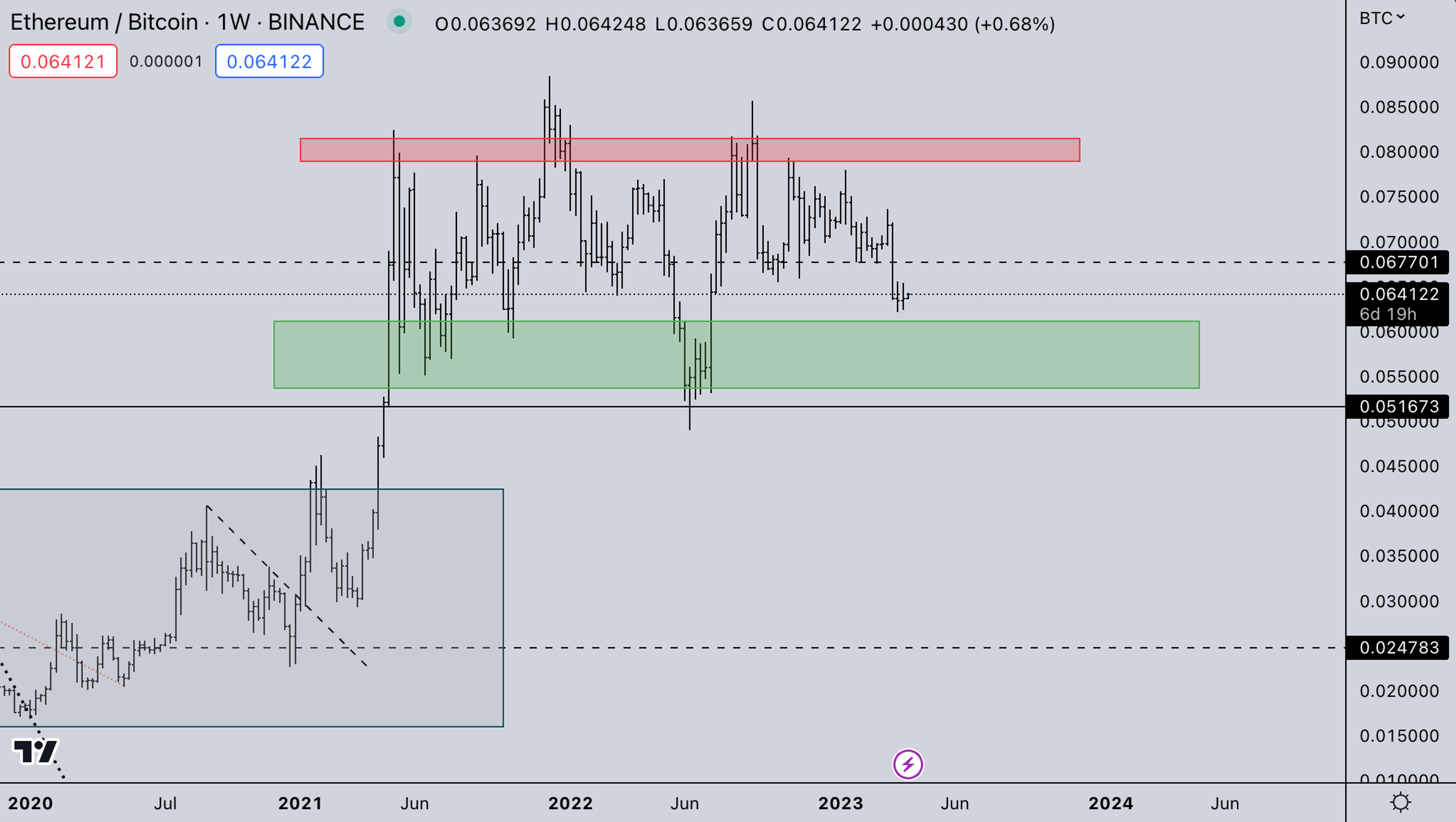 ETH/BTC is also still in no-mans-land as long as it trades in this larger range. To gain any real momentum, it either has to break above the red zone or below the green zone.