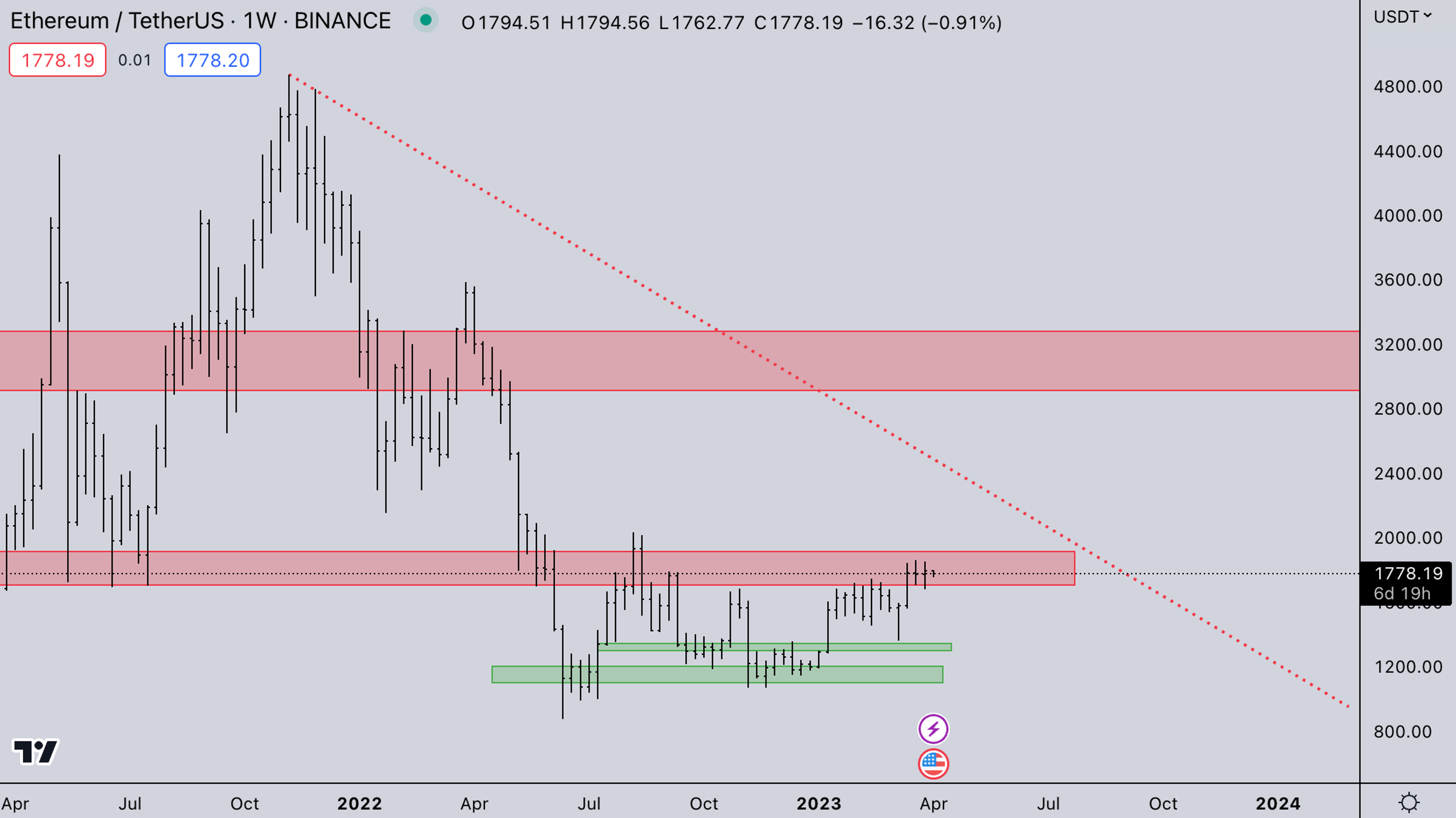 ETH is consolidating on the 2021 lows for quite a bit now. Shanghai upgrade is scheduled for this month (or Shapella Upgrade). The event will likely cause some confusion, especially because of the long delay. At this point, it’s hard to estimate the impact as we’ve been trading “Flat” into it - so there’s no real momentum either way.