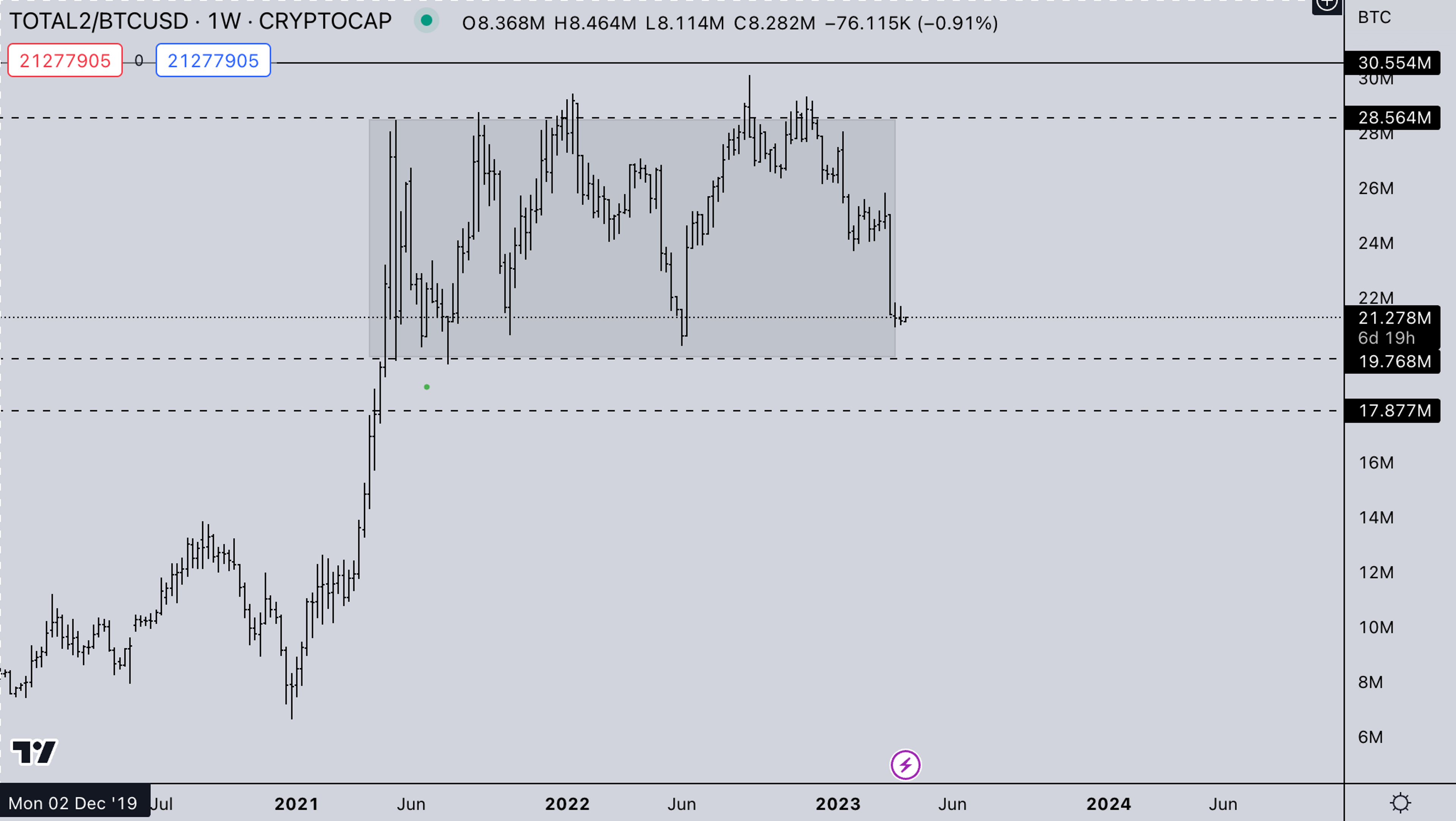 TOTAL2/BTC is still weak but with BTC slowing down right under 30k a viable scenario would be extended range on BTC and altcoins reversing upwards again. For those trading ETH denominated charts, NFT’s are also seemingly building large bases relative to it.
