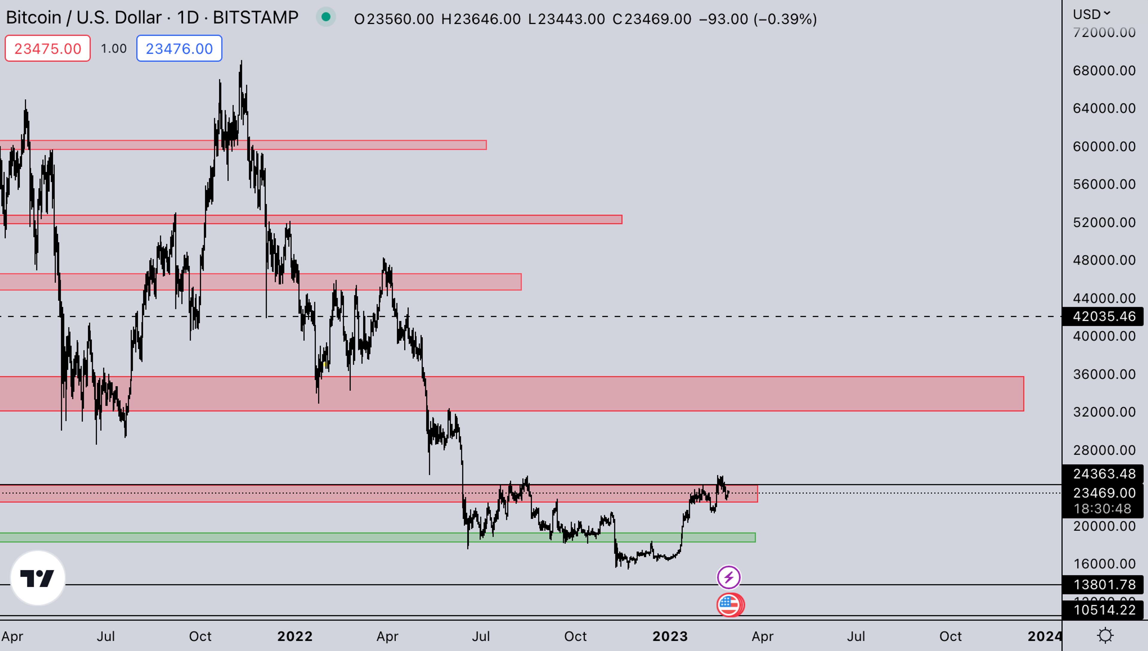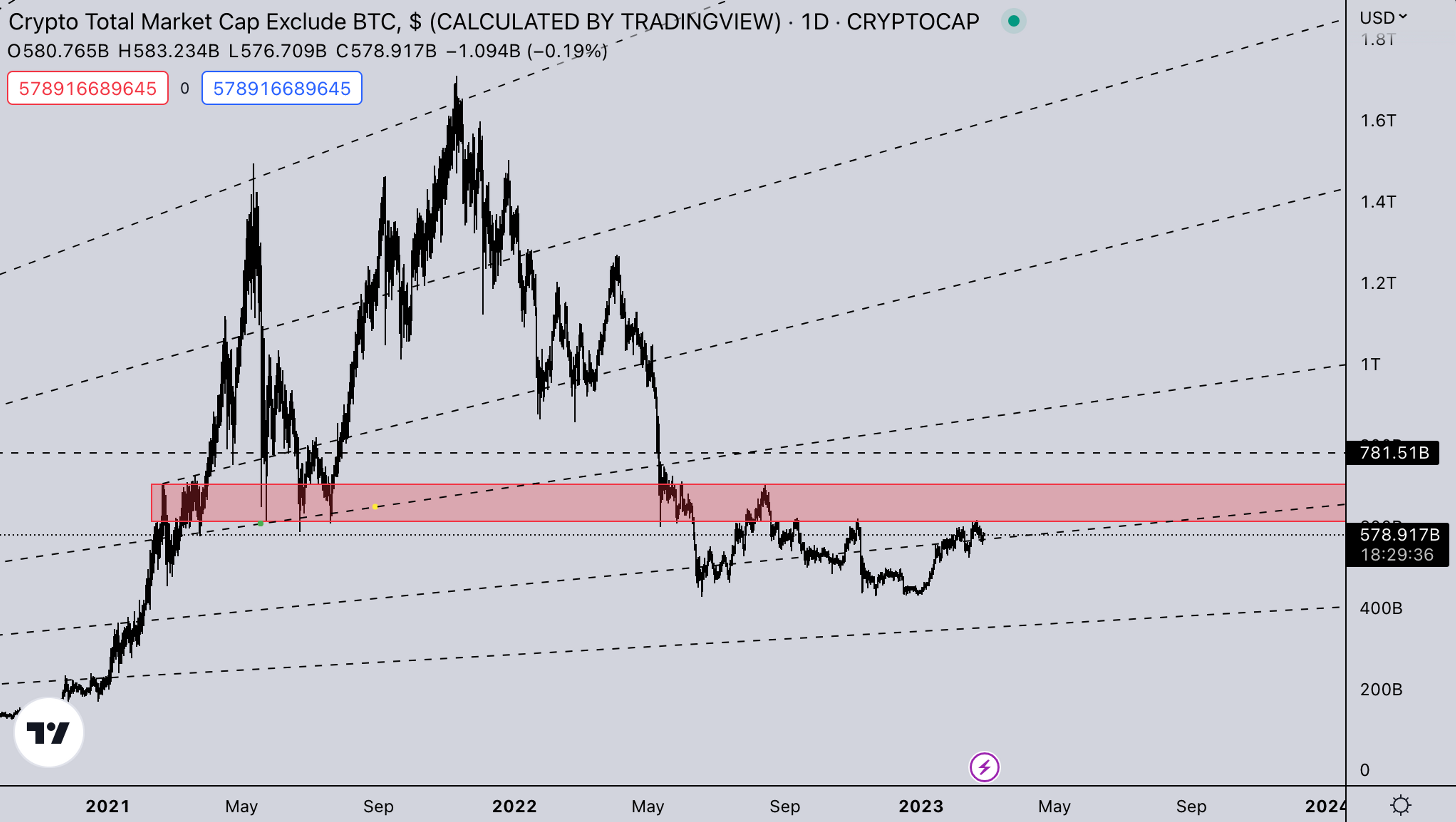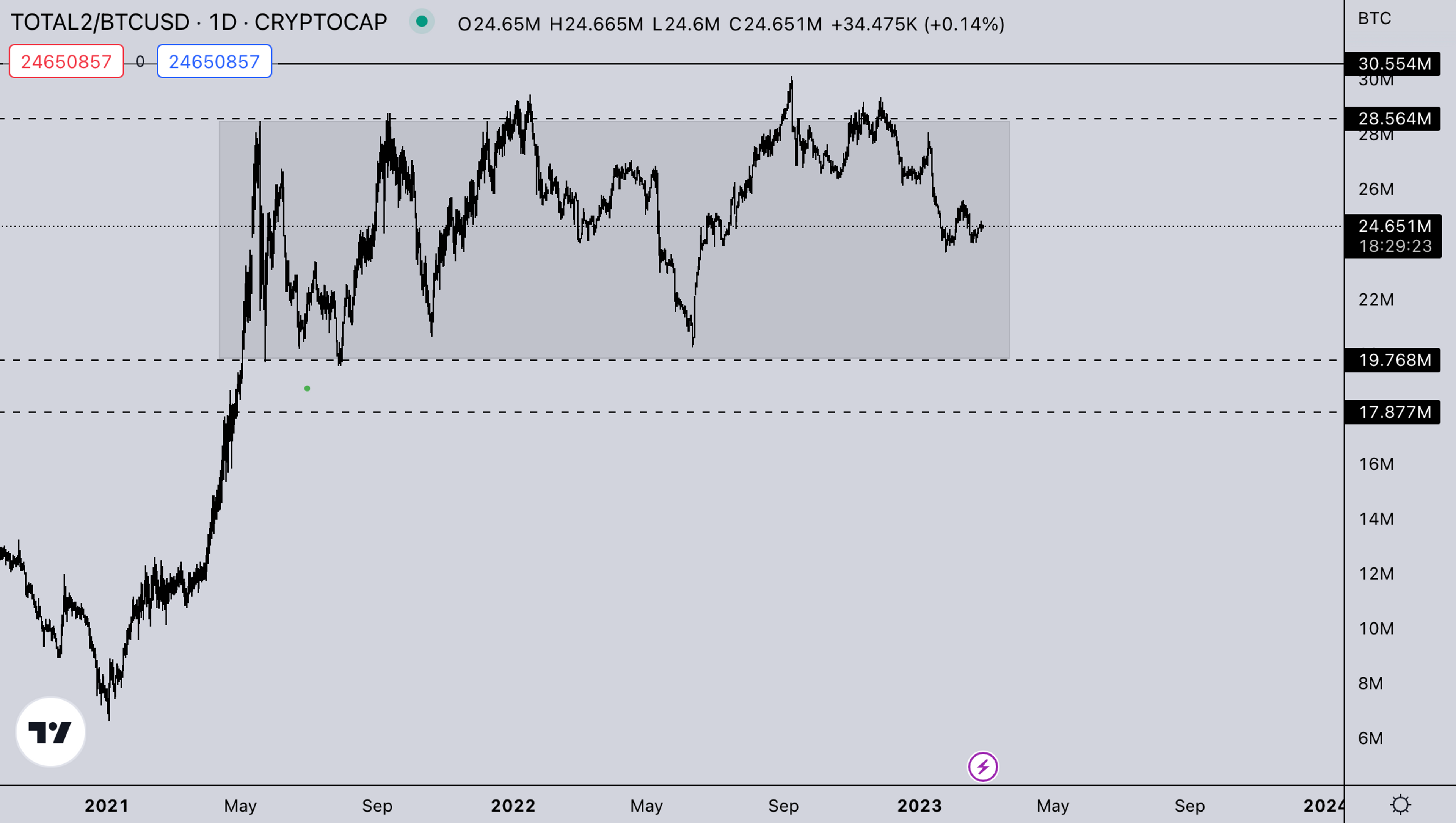 TOTAL2 is also grinding right under 2022 support. ALTS did see a lot of weakness last week with the majority being down 30-50% from the recent highs. We’d expect BTC to take over from here, and show the alts direction on what’s coming next.