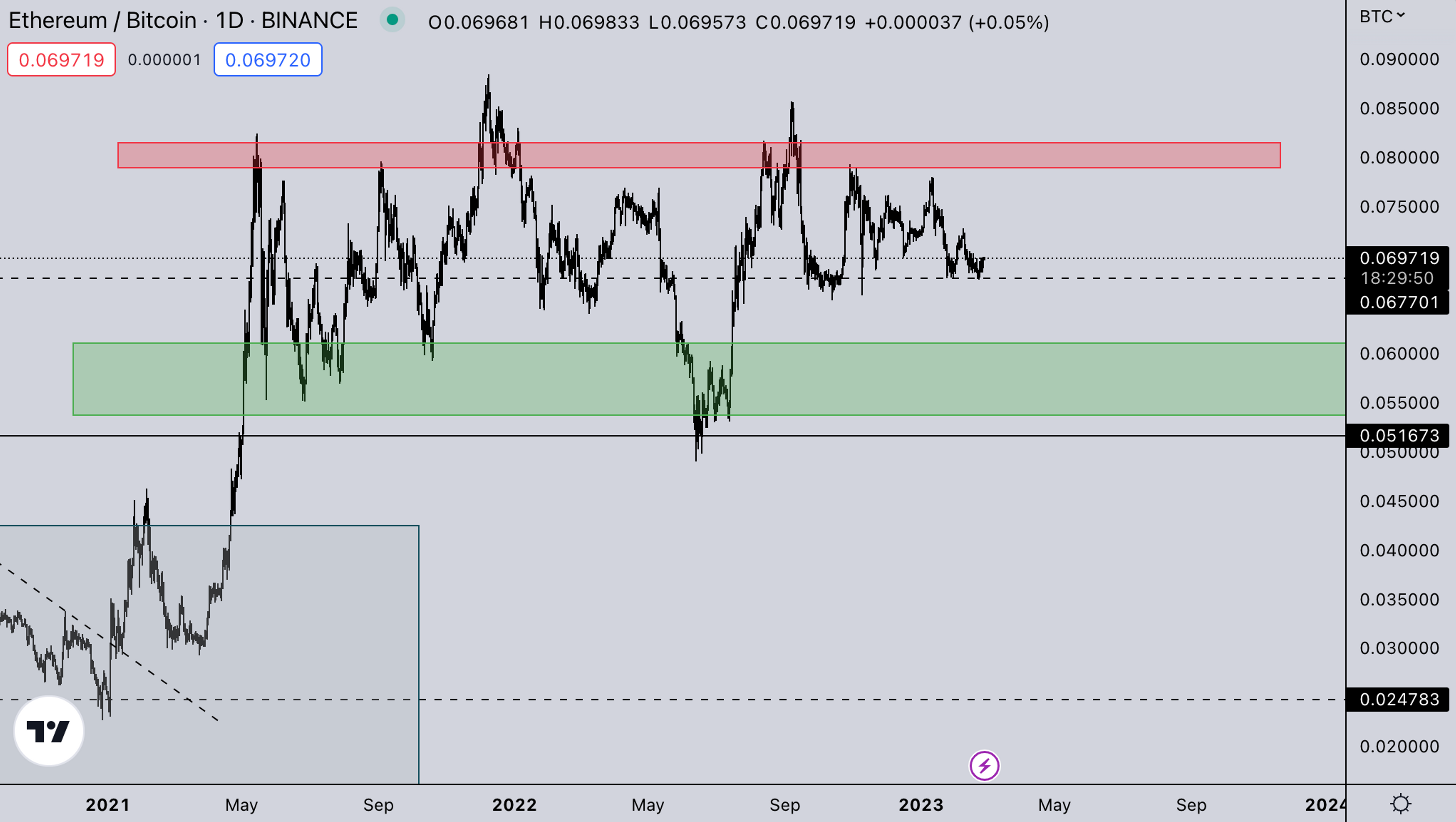 ETH/BTC is still grinding on mid-range. Holding relatively stable, while BTC is also ranging. We’d still expect ETH to likely underperform both upside and downside if BTC would make a bigger move. After the Shanghai upgrade and ETH has unwinded, we’d expect it to perform once again on a relative basis to BTC.