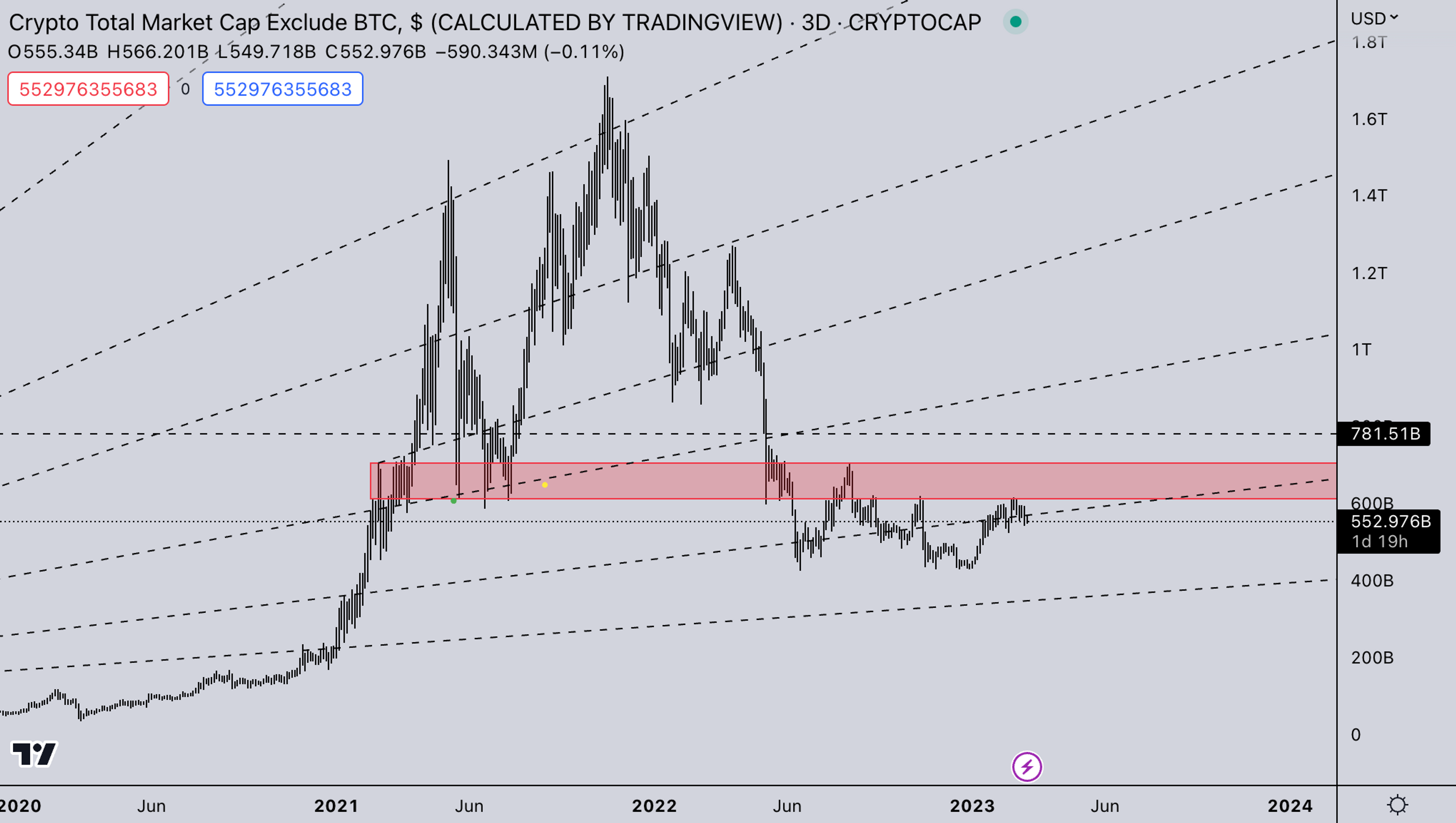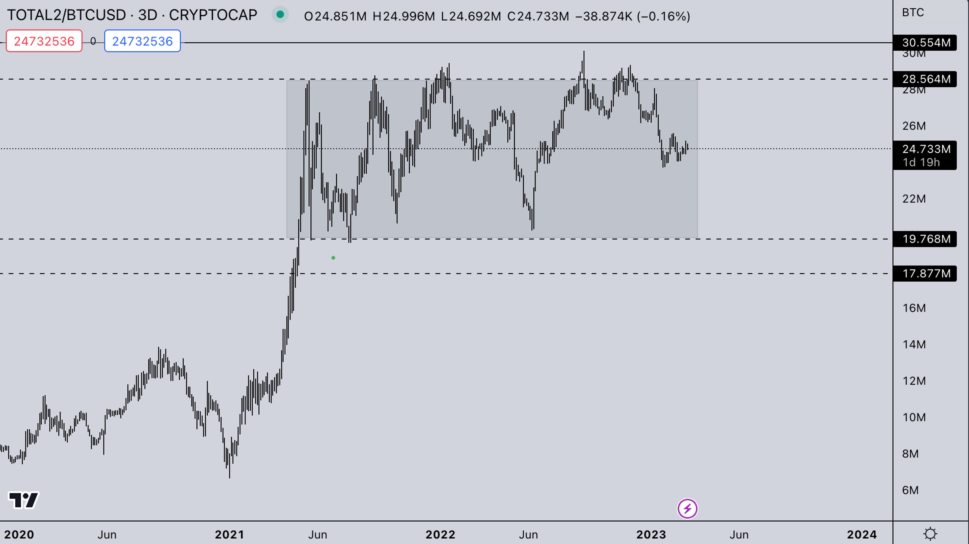 TOTAL2/BTC also still reflects the same picture: sluggish price action with no real relative strength. BTC dominance also seems quite strong which is generally a bad thing for alts, as we don’t wanna see BTC have relative strength over altcoins in the past (Pre 2021 era). BTC had massive time periods of outperformance, which we haven’t seen in a long time. With the current macro environment, it could become a possibility and is something we definitely need to keep an eye on.