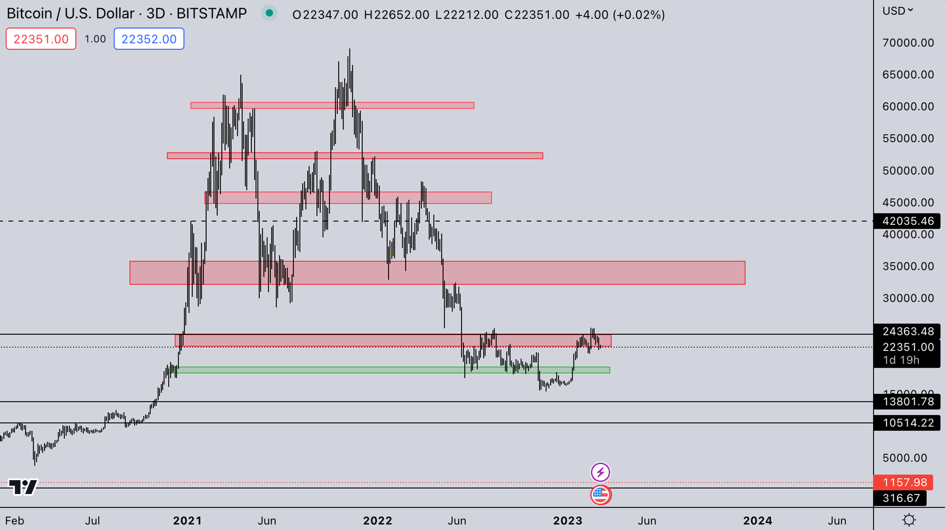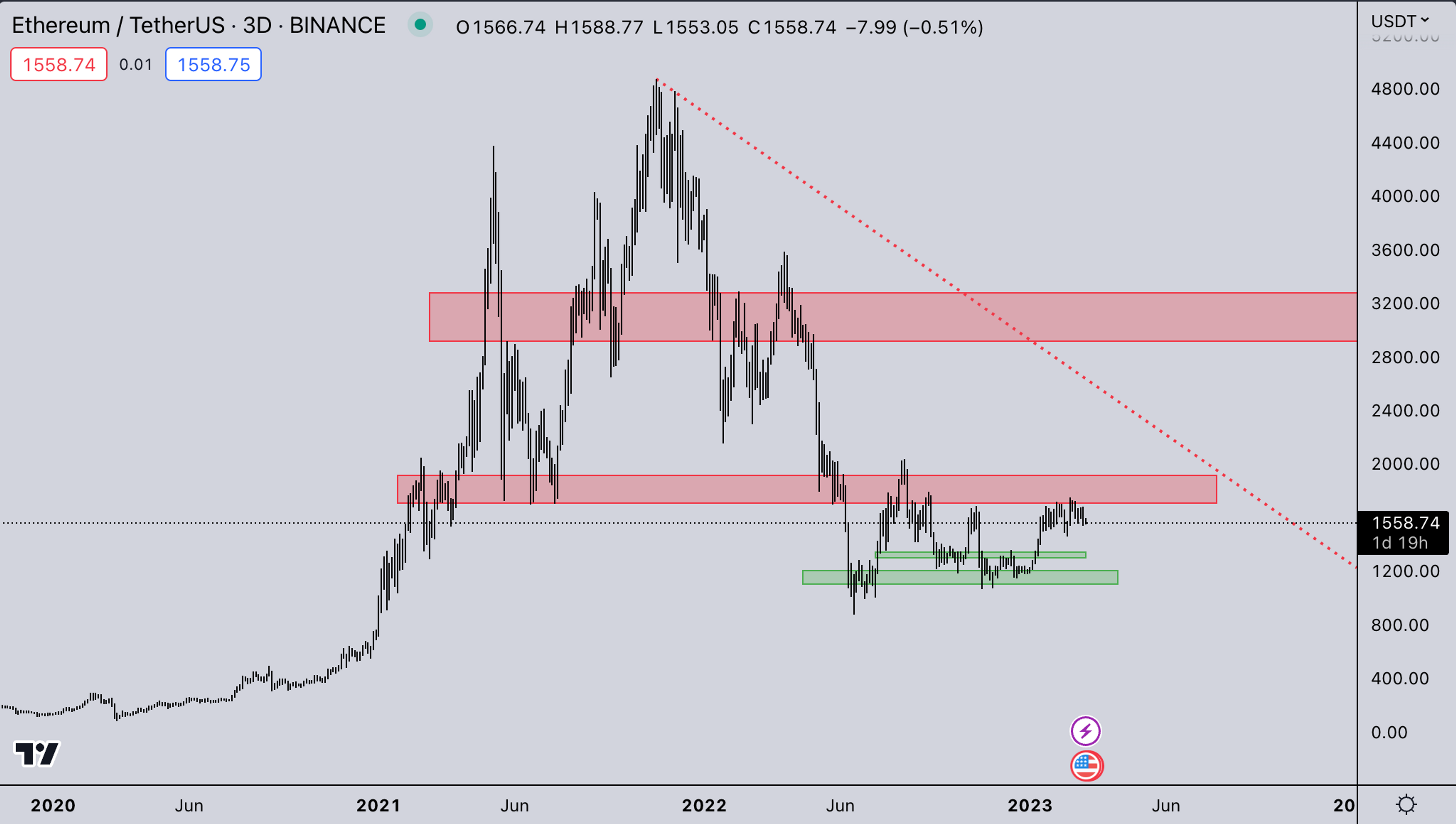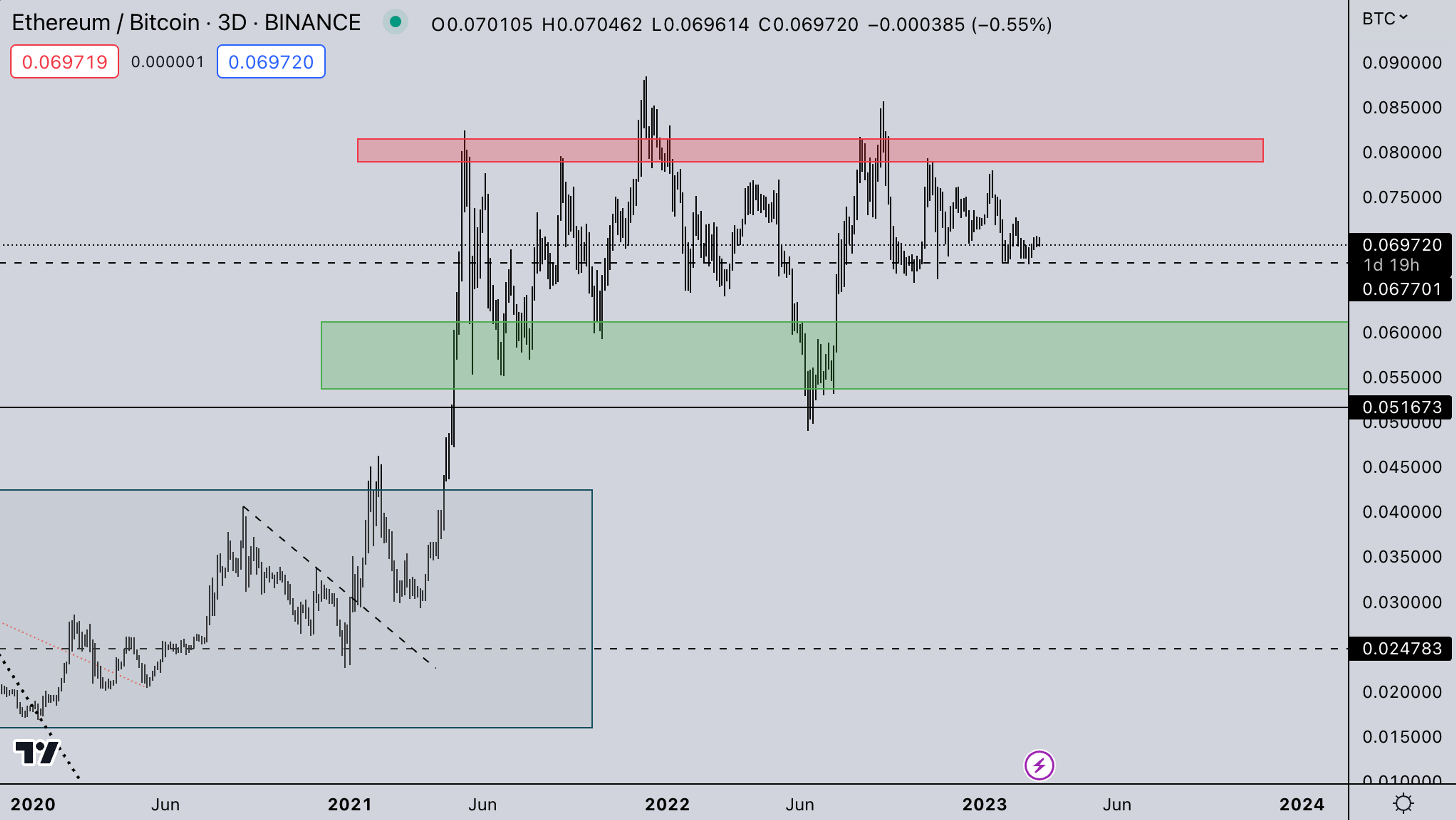 ETH is also still under the 2021 lows. There is some debate on which one can adopt the current view. If you believe that crypto has made macro low and that 3AC liquidation back in May last year was the bottom, then ETH has been forming an accumulation range of almost 12 months (!!)- If one could see anything between 800-1600 “Accumulation”.The other view is that crypto will go lower because of the macro. For this to become a high-probability option, we’d like to see ETH break the FTX low. At this point, this seems miles away - though it would make sense to accumulate any dip close to that price with a mental stop under it (1075-1100).ETH/BTC
