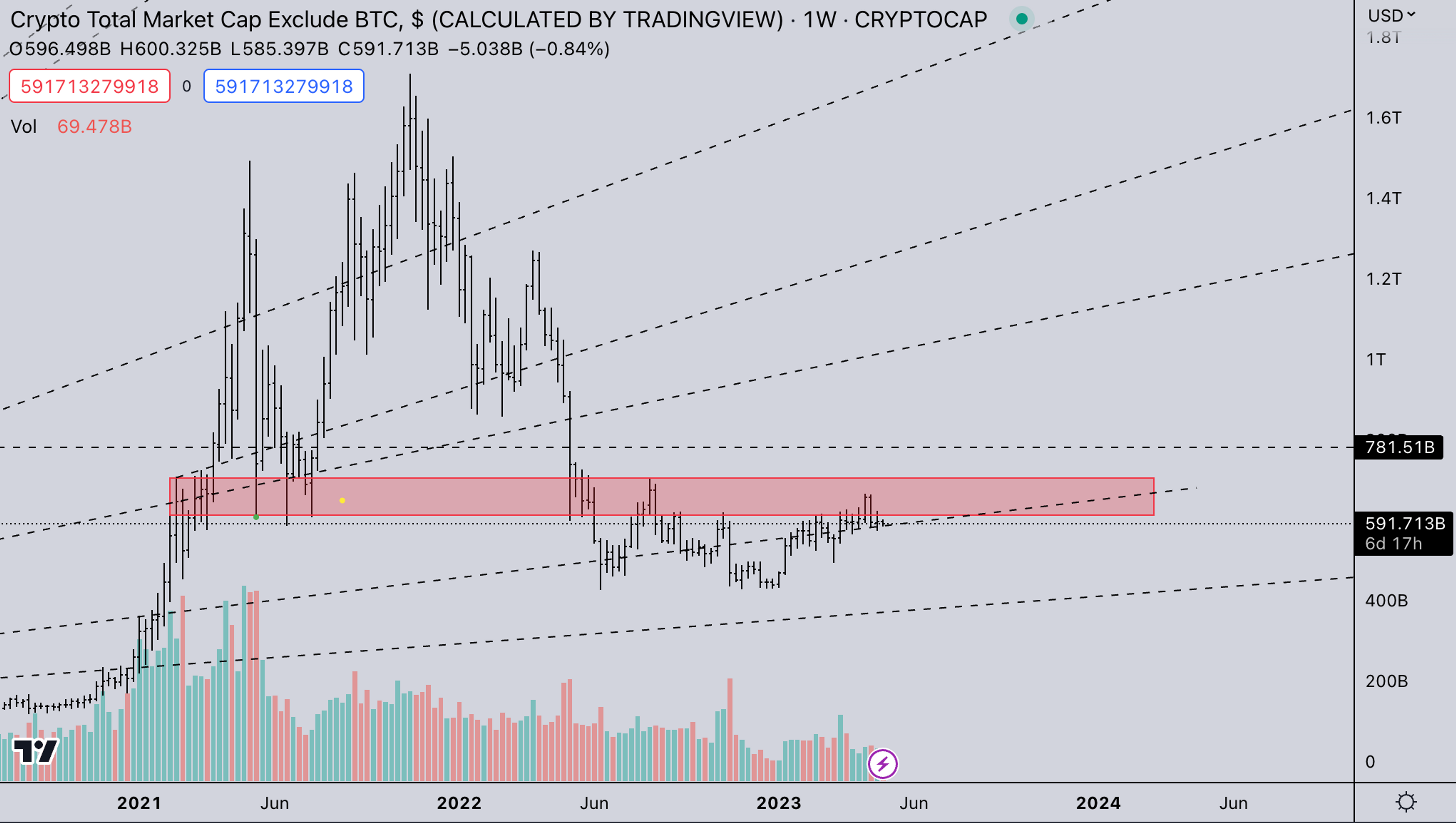 TOTAL2 is also stuck under the 2021 support. The price action is getting quite tight so we’d expect upticks in volatility soon.