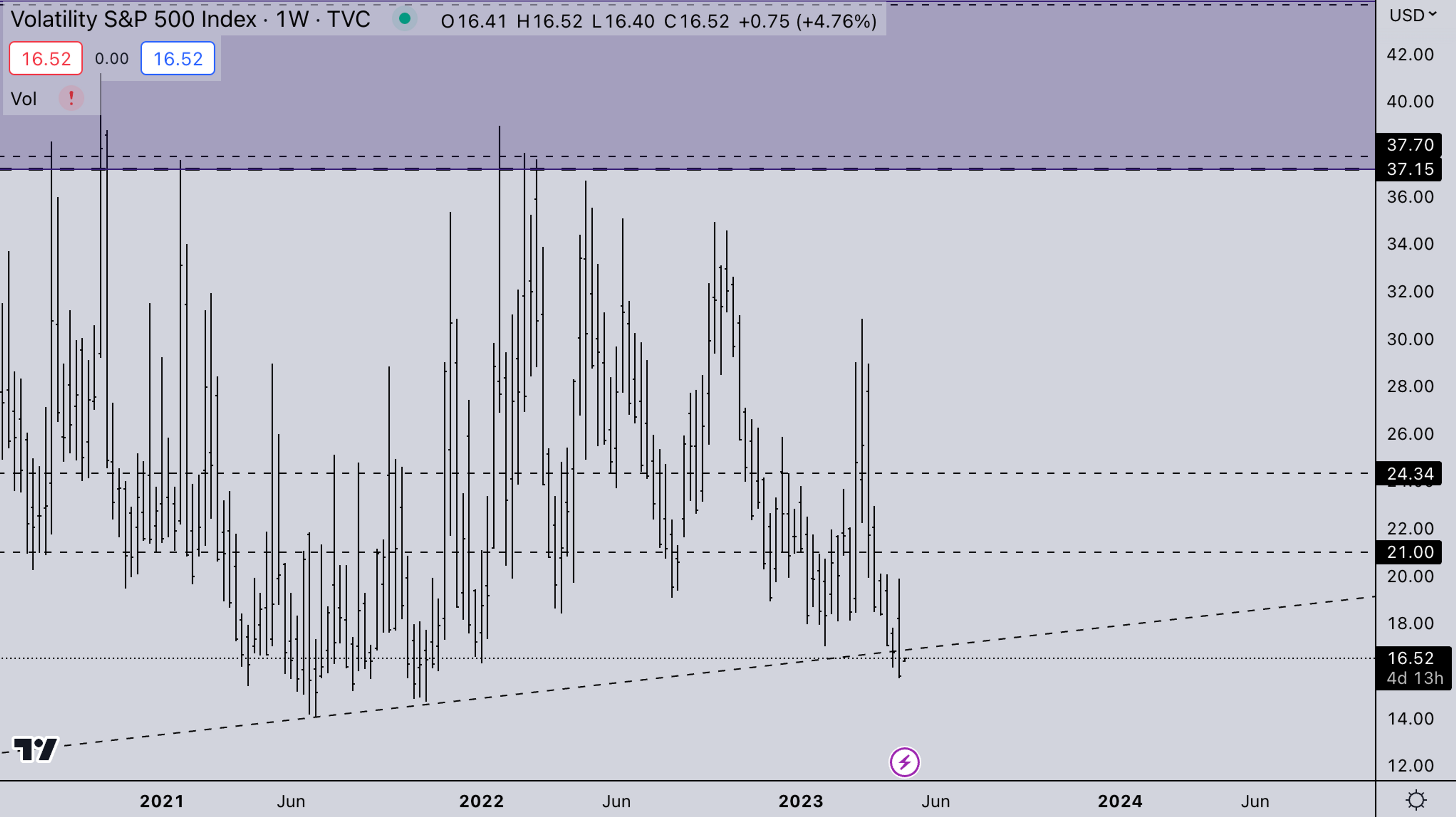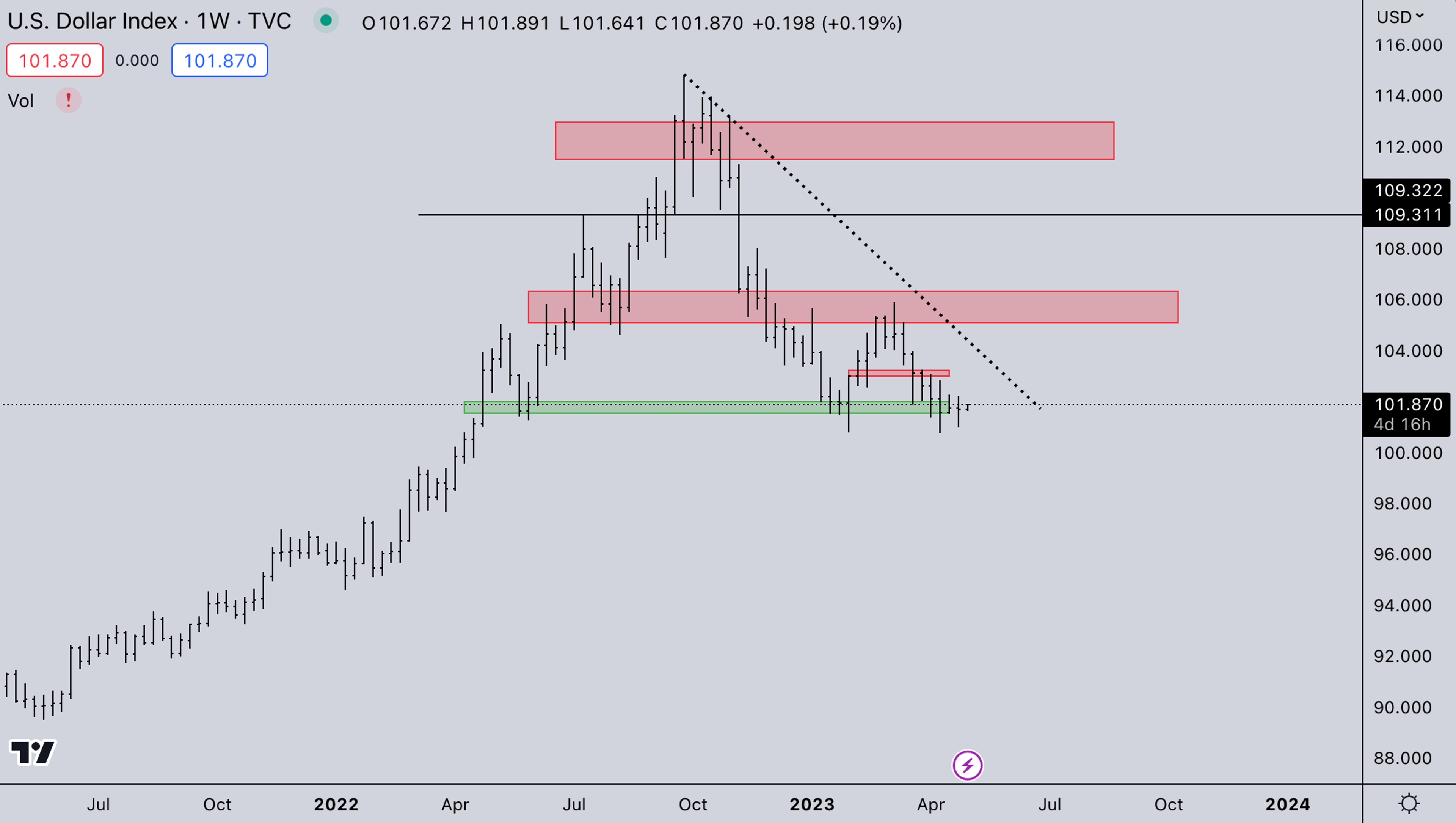 VIX also broke its long-term trend. It could still keep stalling in this zone this should give room for risk assets to go higher if DXY breaks down. If DXY starts going up we’d expect VIX to also increase again. Equities are at a large inflection point so some increase in volatility makes sense.
