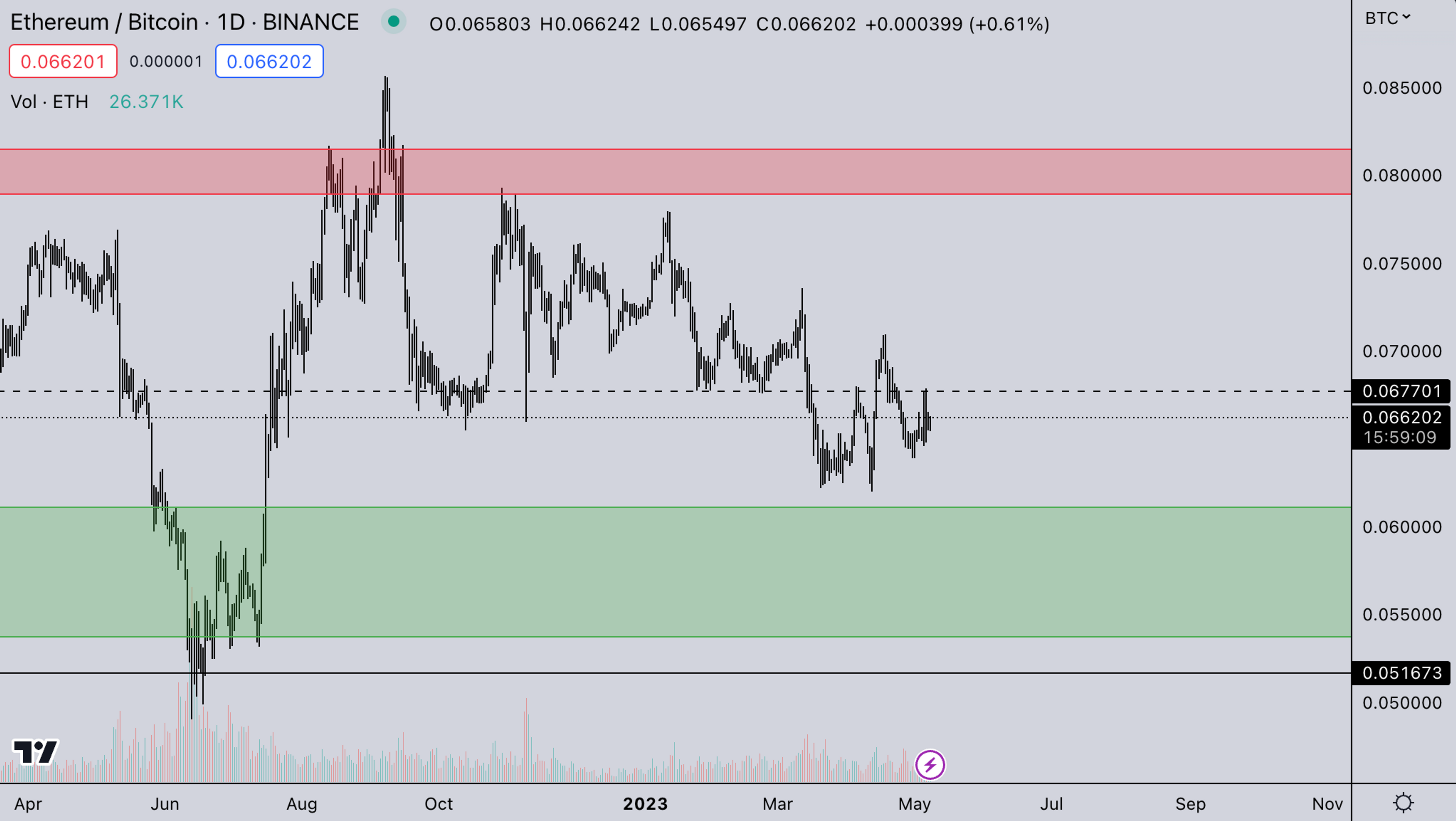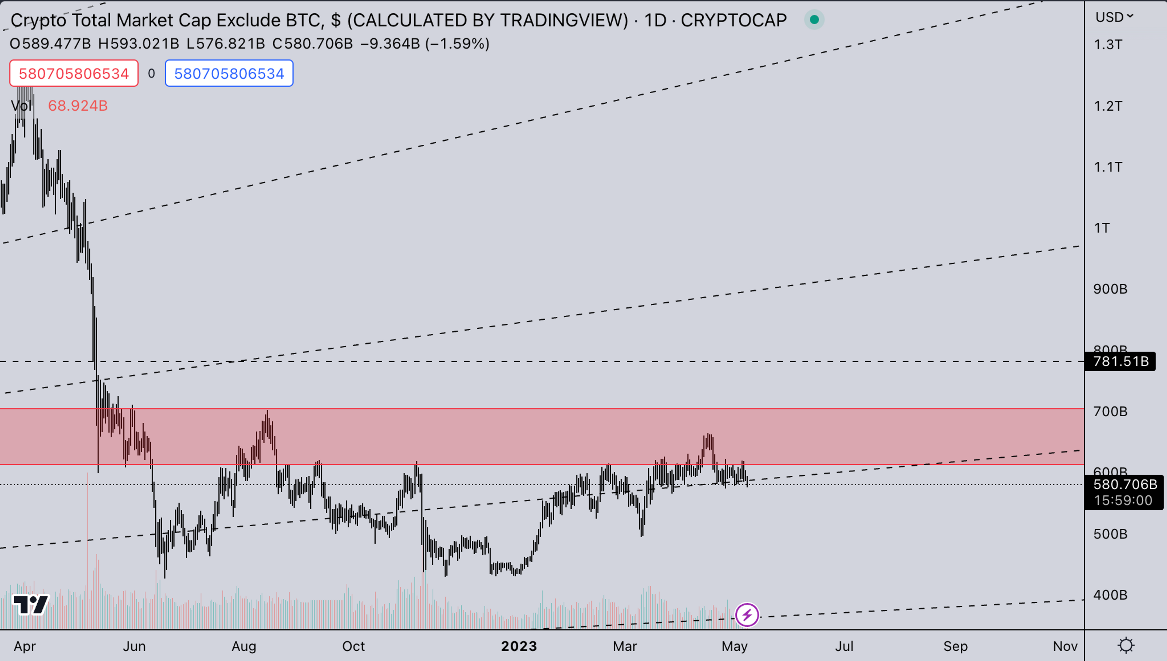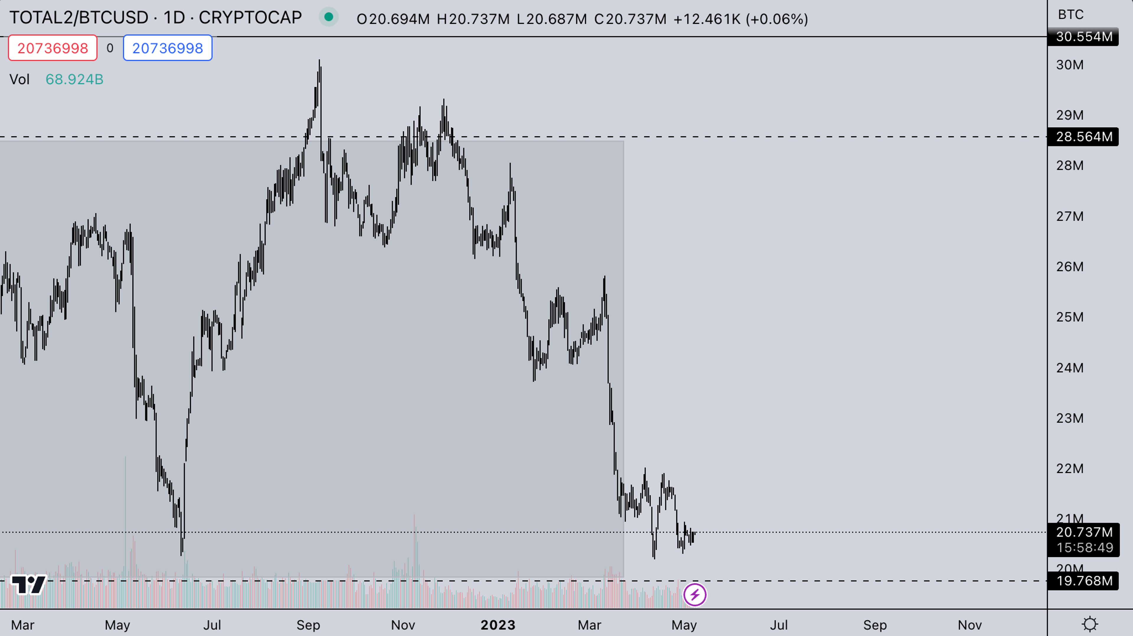 TOTAL2 is still weaker, were ETH actually flipped the 2021 support, so far TOTAL2 hasn’t been able to. This is mainly apparent in a lot of alts already retracing almost their entire move up back to November lows (FTX crash). For now, the market is focusing on new coins + older coins that have relative strength on BTC pairs.